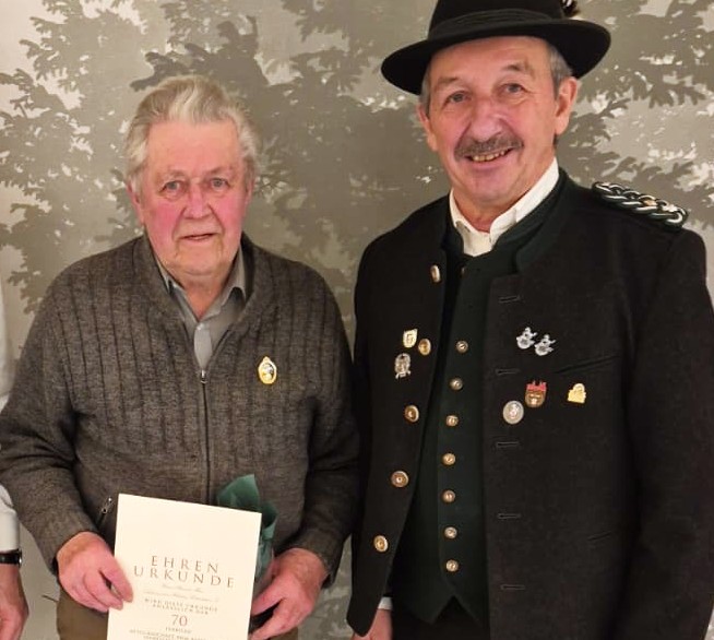 Die seltene Ehrung für 70-jährige Mitgliedschaft konnte Alexander Haas aus Perach – hier im Bild mit dem stellvertretenden Gauschützenmeister Lorenz Bodmaier – entgegen nehmen.