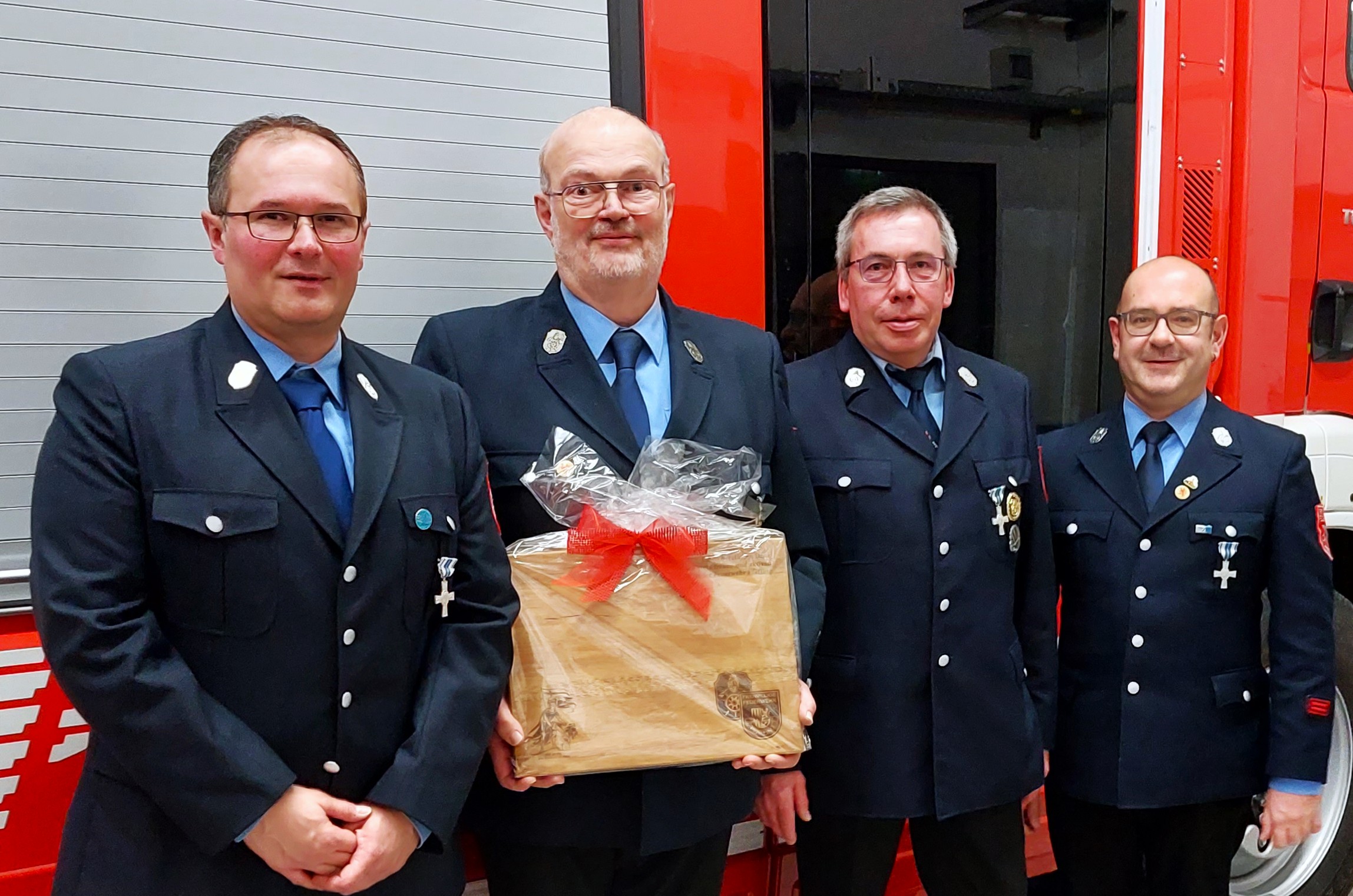 Verbunden mit einem riesengroßen Dankeschön für so viel ehrenamtliches Engagment: Peter Hohenadler schied nach stolzen 45 Jahren aus dem aktiven Dienst der Feuerwehr aus.