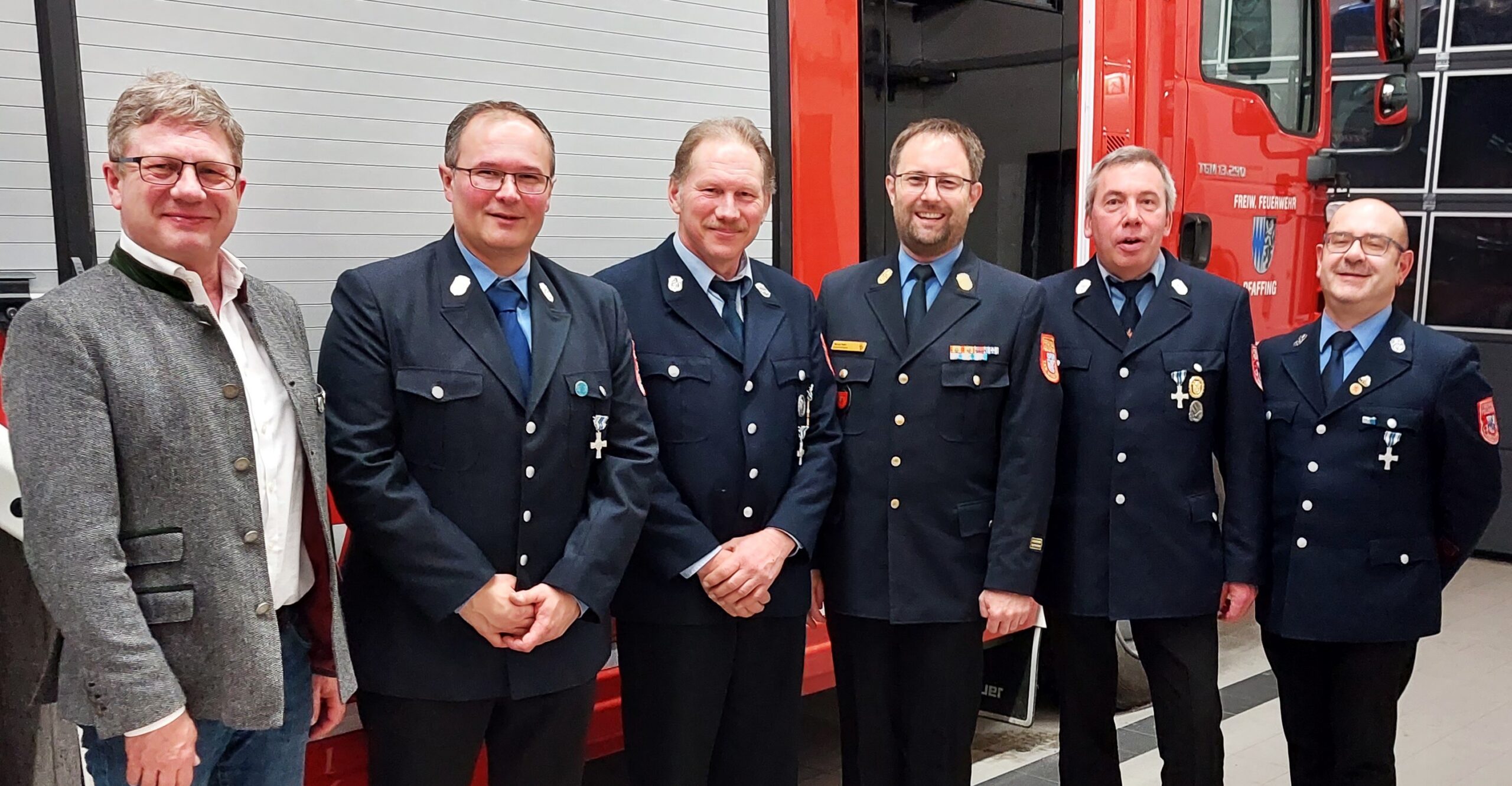 Auf dem Foto von links Pfaffings stellvertretender Kommandant Georg Gürtler, Peter Hohenadler, Feuerwehr-Vorstand Klaus Traunsteiner sowie der stellvertretende Vorsitzende Florian Eutermoser …