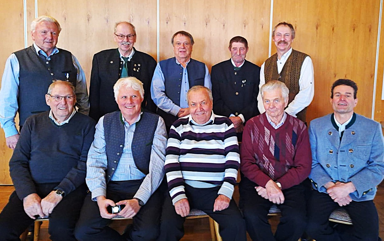 sowie stehend von links Obmann Pius Graf mit den Geehrten Michael Betzl (Vorstand), Paul Hiebl, Josef Wieser und Martin Eisenrichter.