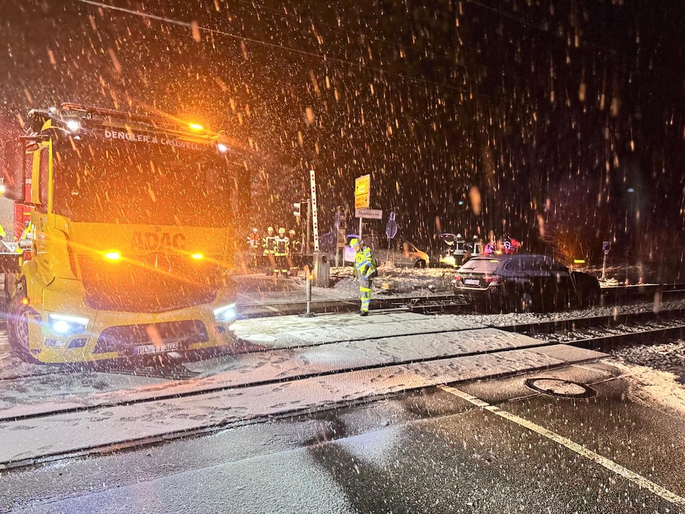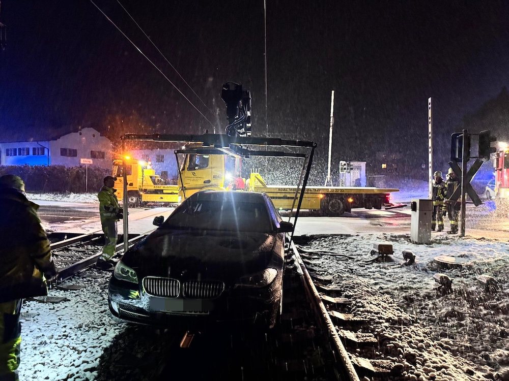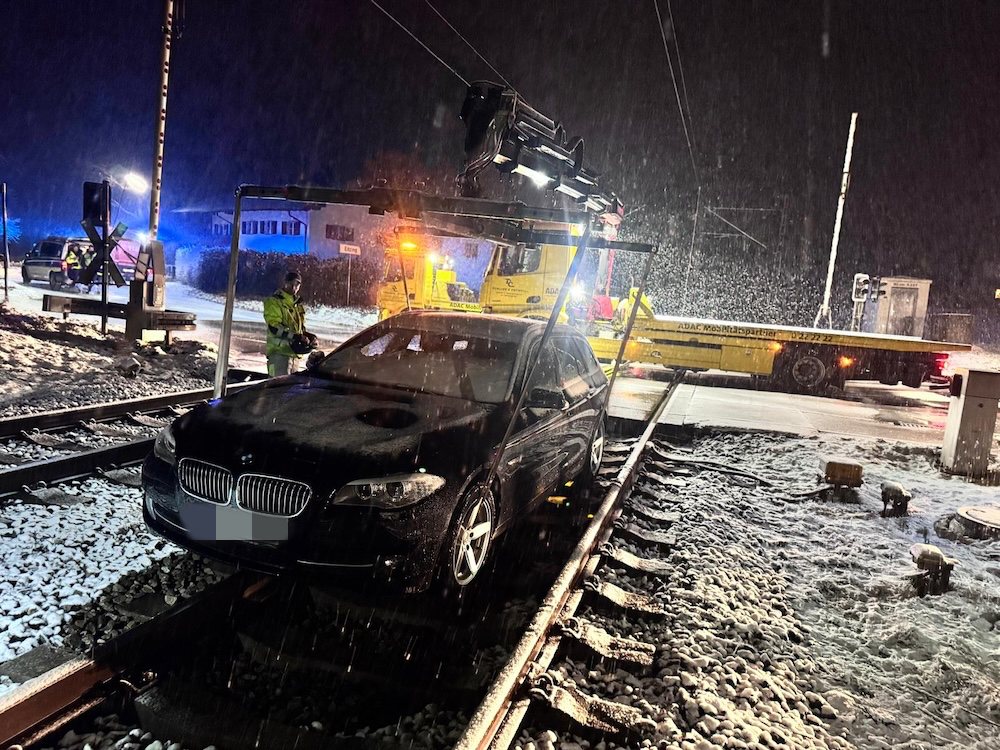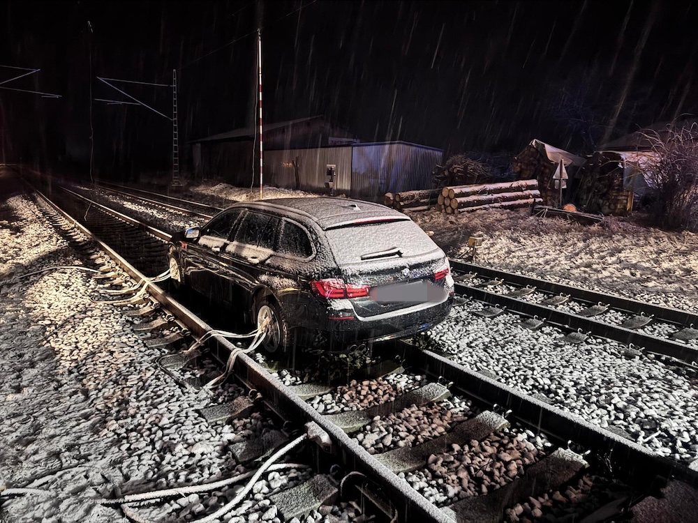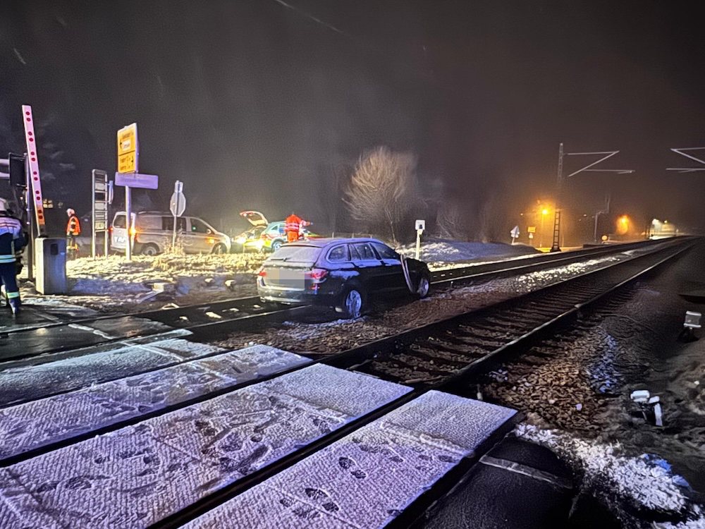 Ein eigenständiges Herausfahren mit dem festgefahrenen Pkw war dem Mann nicht mehr möglich, deshalb erfolgte durch die alarmierten Rettungskräfte die sofortige Sperrung des Zugverkehrs.