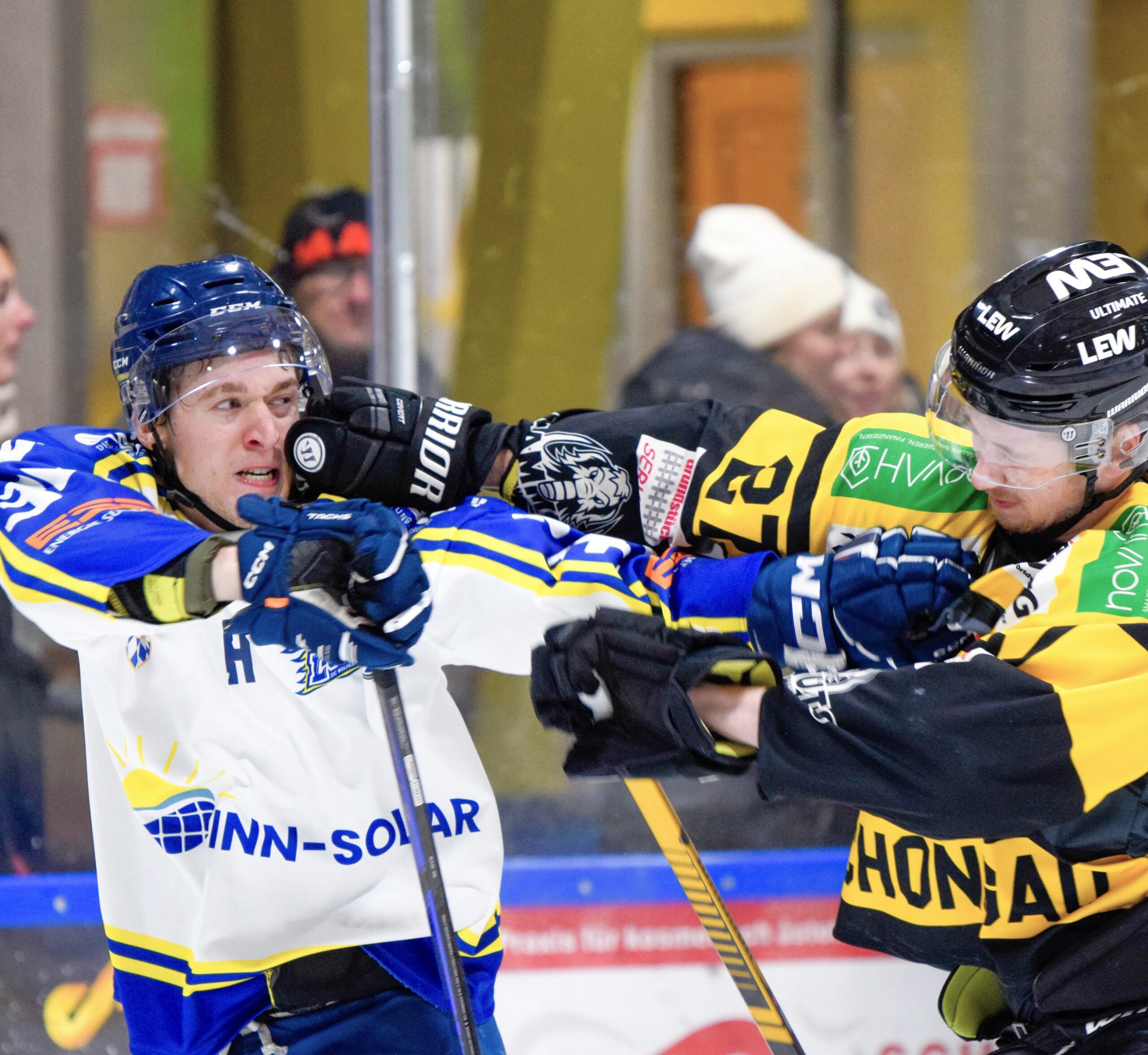 Na, eigentlich geht’s um Eishockey und nicht um einen Boxkampf: Die Nerven blank im Abstiegskampf – rechts Schongau im Angriff, links der EHC. Nach einer erneut durchwachsenen Leistung verloren die Eishockey-Löwen aus Waldkraiburg ihr Auswärtsspiel bei der EA Schongau gestern Abend mit 2:5. Schon am Freitag-Abend hatte man in der Overtime mit 3:4 daheim verloren.