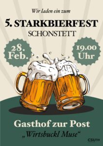 Darüber hinaus lädt die CSU am Samstag, 28. Februar zum Starkbierfest im Gasthof zur Post ein. Alle Bürger sind willkommen. Das Fest steht bewusst im Zeichen der Gemeinschaft – ungezwungen, gesellig und fernab politischer Hintergründe.