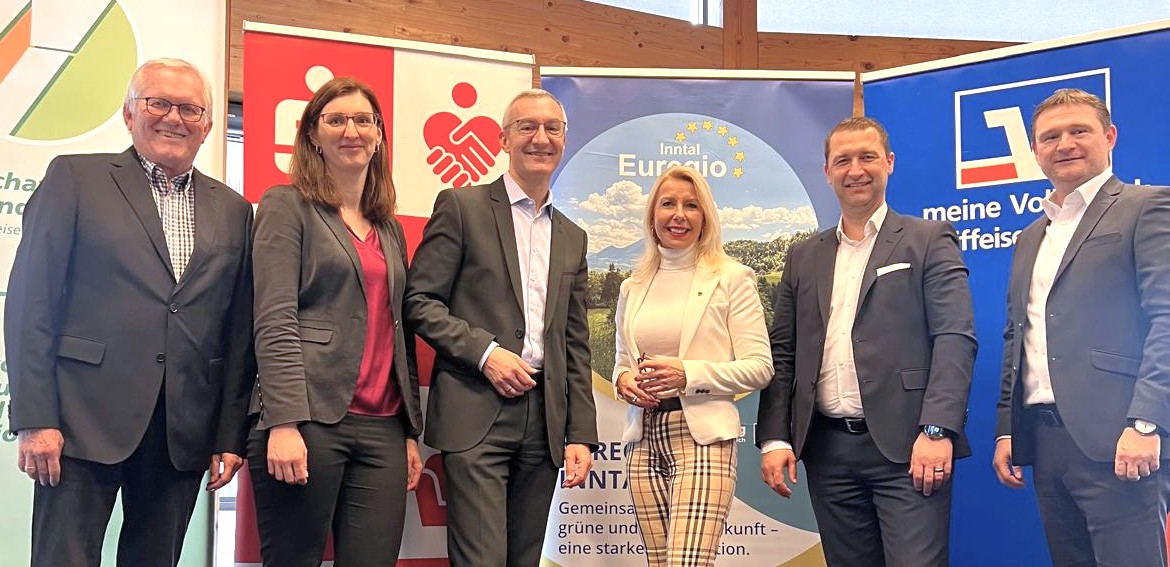 1. Vorsitzender Wirtschaftlichen Verbands der Stadt und des Landkreises Rosenheims – Reinhold Frey – Regina Forstner von der Sparkasse Rosenheim Bad-Aibling, das Vorstandsmitglied der Sparkasse Rosenheim-Bad Aibling – Stephan Donderer – Euregio Inntal Präsidentin Barbara Schwaighofer sowie Roland Seidl, Vorstandsmitglied der meine Volksbank Raiffeisenbank eG und Jens Köhler von meine Volksbank Raiffeisenbank eG.