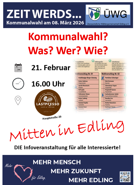 Vor allem auch um den JungwählerInnen aus der Gemeinde die wichtigsten Regeln und Abläufe zur Kommunalwahl näher zu bringen: Die Edlinger ÜWG mit ihrer Bürgermeister-Kandidatin Nicole Bauer-Schäfer lädt am kommenden Samstag, 21. Februar, ab 16 Uhr ins „Lastpresso“ direkt am Rathausplatz in Edling ein. Alle interessierten Bürger sind herzlich willkommen.
