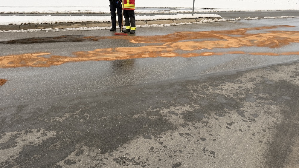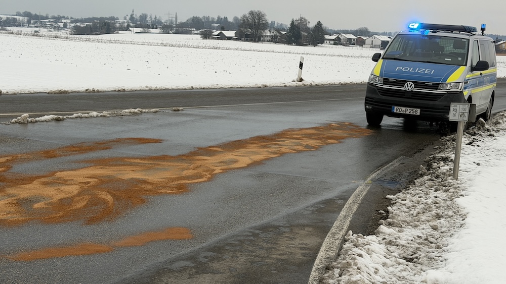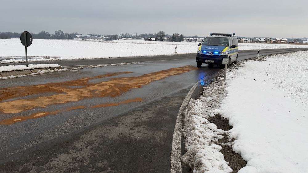 Dass die Feuerwehr eine Ölspur beseitigt, das gehört zum Alltag der Einsatzkräfte. Wie diese Ölspur heute Nachmittag bei Eiselfing entstanden ist, dürfte aber eher nicht alltäglich sein. Beim Abbiegen Richtung Eiselfing hörten zwei Sanitäter der Johanniter unter ihrem Rettungswagen ein lautes Geräusch. Der Fahrer stoppte den Wagen umgehend noch in der Kreuzung. Die beiden Sanitäter staunten nach dem Aussteigen nicht schlecht. Ihr Rettungswagen war über einen Plastik-Kanister mit Altöl gerollt, der offenbar von der Ladefläche eines anderen Fahrzeugs gerollt war. Das Altöl hatte sich beim Überfahren des Kanisters großflächig über die Fahrbahn verteilt und sorgte für schmierigen Fahrbahnbelag – im Kreuzungsbereich alles andere als ungefährlich.