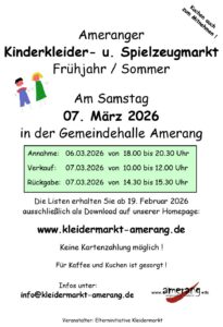 Der beliebte Kinderkleider- und Spielzeugmarkt in Amerang findet am Samstag, 7. März, von 10 bis 12 Uhr in der Gemeindehalle statt. Verkauft werden Baby- und Kinderbekleidung für Frühjahr und Sommer, Schuhe, Spielzeug, Bücher, Sportartikel, Auto- und Fahrradsitze, Kinderwagen, Umstandsmode und vieles mehr. Für Kaffee und Kuchen ist gesorgt, gerne auch zum Mitnehmen.