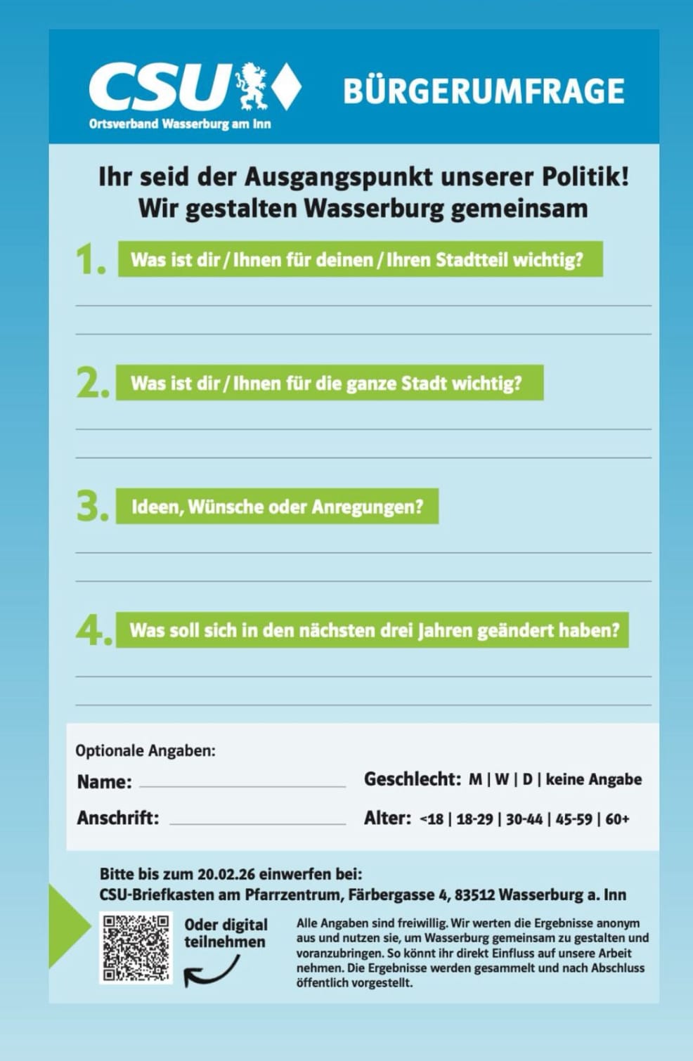 Dazu die Wasserburger CSU; „Wir wollen bewusst nicht über die Köpfe der Menschen hinweg diskutieren, sondern konkrete Rückmeldungen aus den Stadtteilen und zur gesamten Stadt sammeln. Die Ergebnisse werden anonym ausgewertet und sollen eine Grundlage für unsere kommunalpolitische Arbeit und Prioritätensetzung in den kommenden Jahren sein.“