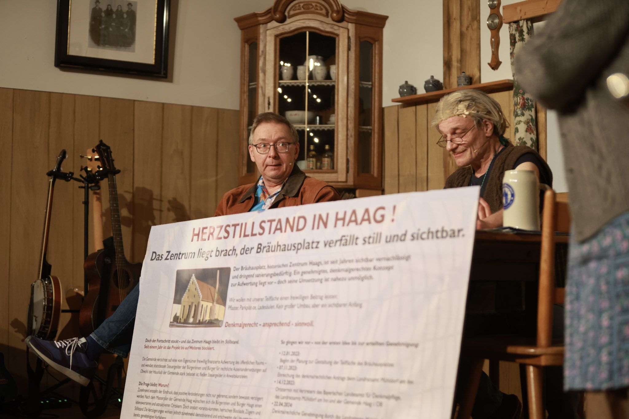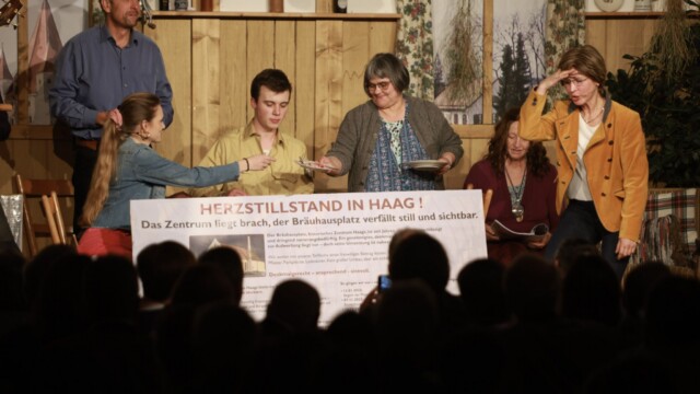 Herzstillstand in Haag, ein Hauberling-Komplott und gibt´s am Ende sogar „a Leich“? Einen packenden Eberhofer-Krimi gab es gestern zu sehen, angelehnt an den Wahlkampf zwischen den beiden Hauptprotagonisten Franz alias Florian und Susi alias Sissi. Wer nun das Rennen um das Rathaus gewinnt, wurde nicht klar, dazu sind die Bürger am 8. März aufgerufen. Der ungewisse Ausgang des Stücks schmälert allerdings nicht den Erfolg des Singspiels beim Haager Starkbierfest, für das gestern im vollbesetzten Grandls Hofcafe, mit viel Prominenz aus Haag und dem Umland, der Startschuss gegeben wurde – mit vollem Erfolg und einem am Ende vor Begeisterung jubelndem Publikum und Standing Ovations.