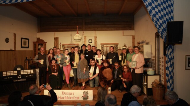 Wie alle Jahre ist es dem Starkbierfest-Team gelungen, einen kurzweiligen lustigen, aber auch nachdenklichen Abend, bei dem kein Auge trocken blieb, ins Hofcafe zu zaubern. Herausragend waren wieder die Gesangseinlagen vom „Haager Viergesang“ mit Barbara und Walter Glück, Christiane und Hans Urban, sowie Hans Furch und Florian Furch an den Instrumenten. Brilliant die Darbietungen als Sissi Schätz zu „Das Amt gehört zu mir“ oder Florian Haas zu „Noch kurz die Welt retten“. Auch die Reise der Trachtenblaskapelle Ramsau nach New York wurde musikalisch aufbereitet – „Wir war´n noch niemals in New York“. Großer Applaus vom Publikum dafür.