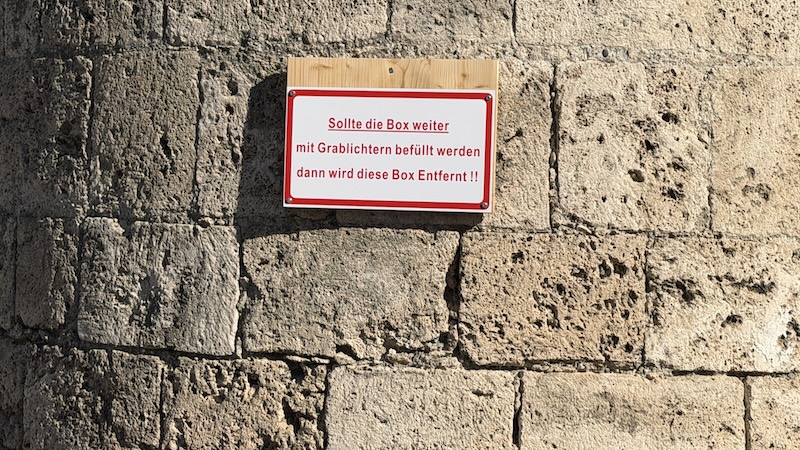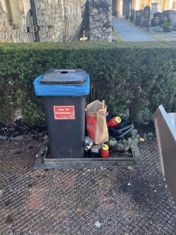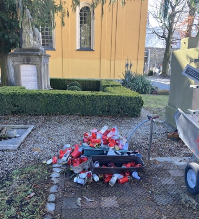 Doch mit der Entfernung der Mülltonnen hat man die Situation auf dem Friedhof offenbar eher verschlimmert, als verbessert. Denn seit einiger Zeit werden jetzt ausgediente Grablichter und anderer Müll eben wild auf dem Friedhofsareal (siehe Fotos) entsorgt. Da helfen auch Warntafeln und die zwei, speziell für Grablichter aufgestellten Tonnen, offenbar nichts. An manchen Tagen herrscht das reinste Müll-Chaos auf dem sonst so schönen Ort der Ruhe.