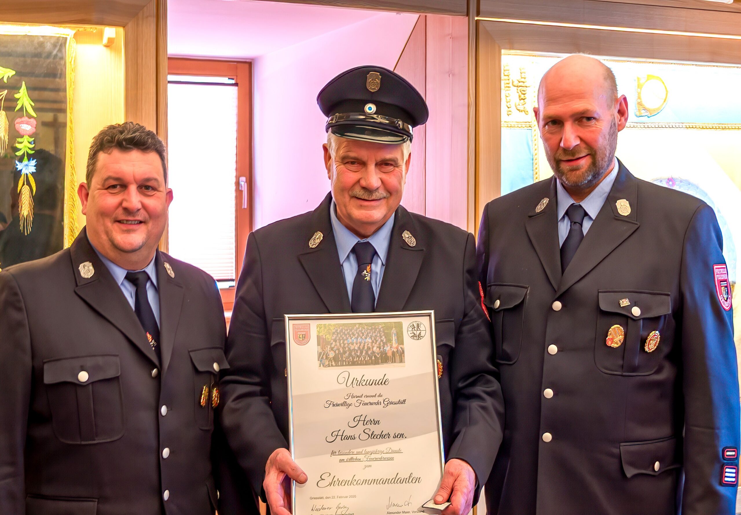 Ein Höhepunkt des Abends war für ihn – Hans Stecher (Bildmitte). Für seine langjährigen Verdienste um die Griesstätter Feuerwehr wurde er zum Ehrenkommandanten ernannt. Links Vorstand Alex Maier und rechts Kommandant Georg Weiderer.