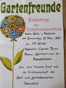 Am Donnerstag, 12. März, findet um 19.30 Uhr die Frühjahrsversammlung des Obst- und Gartenbauvereins Oberndorf beim Wirth z´Moosham statt.