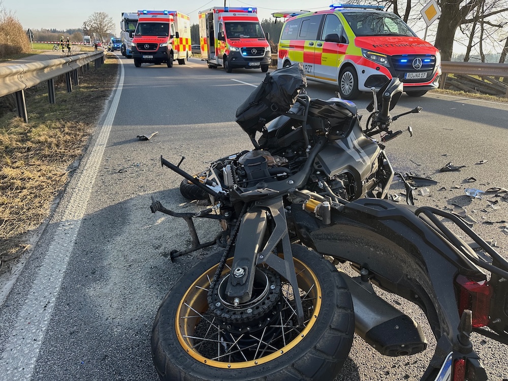 Der Fahrer des Motorrads wurde durch Ersthelfer und den eingetroffenen Rettungsdienst versorgt und mit schweren Verletzungen durch einen Hubschrauber in ein nahegelegenes Krankenhaus gebracht. Nähere Informationen zu seinem Gesundheitszustand liegen derzeit nicht vor.