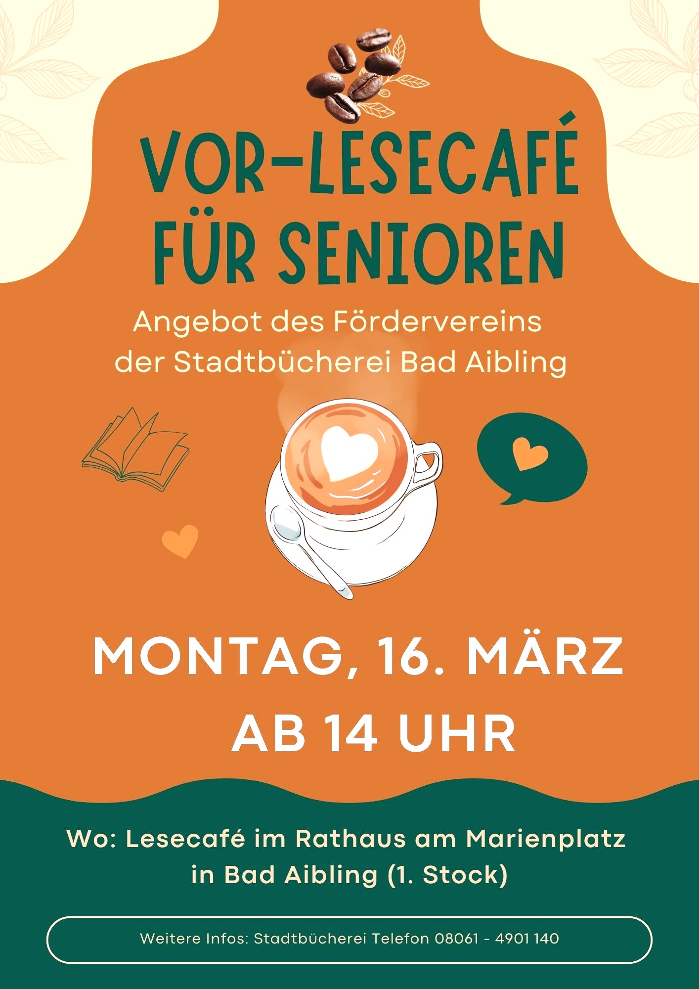 Ein Vor-Lesecafé für Senioren – diese schöne Idee wird jetzt in der Stadtbücherei in Bad Aibling umgesetzt. Der Förderverein der Stadtbücherei lädt erstmals ein. Die neue Veranstaltungsreihe richtet sich an Seniorinnen und Senioren sowie an alle Junggebliebenen, die gerne zuhören, sich austauschen und einen unterhaltsamen Nachmittag in angenehmer Gesellschaft verbringen möchten.
