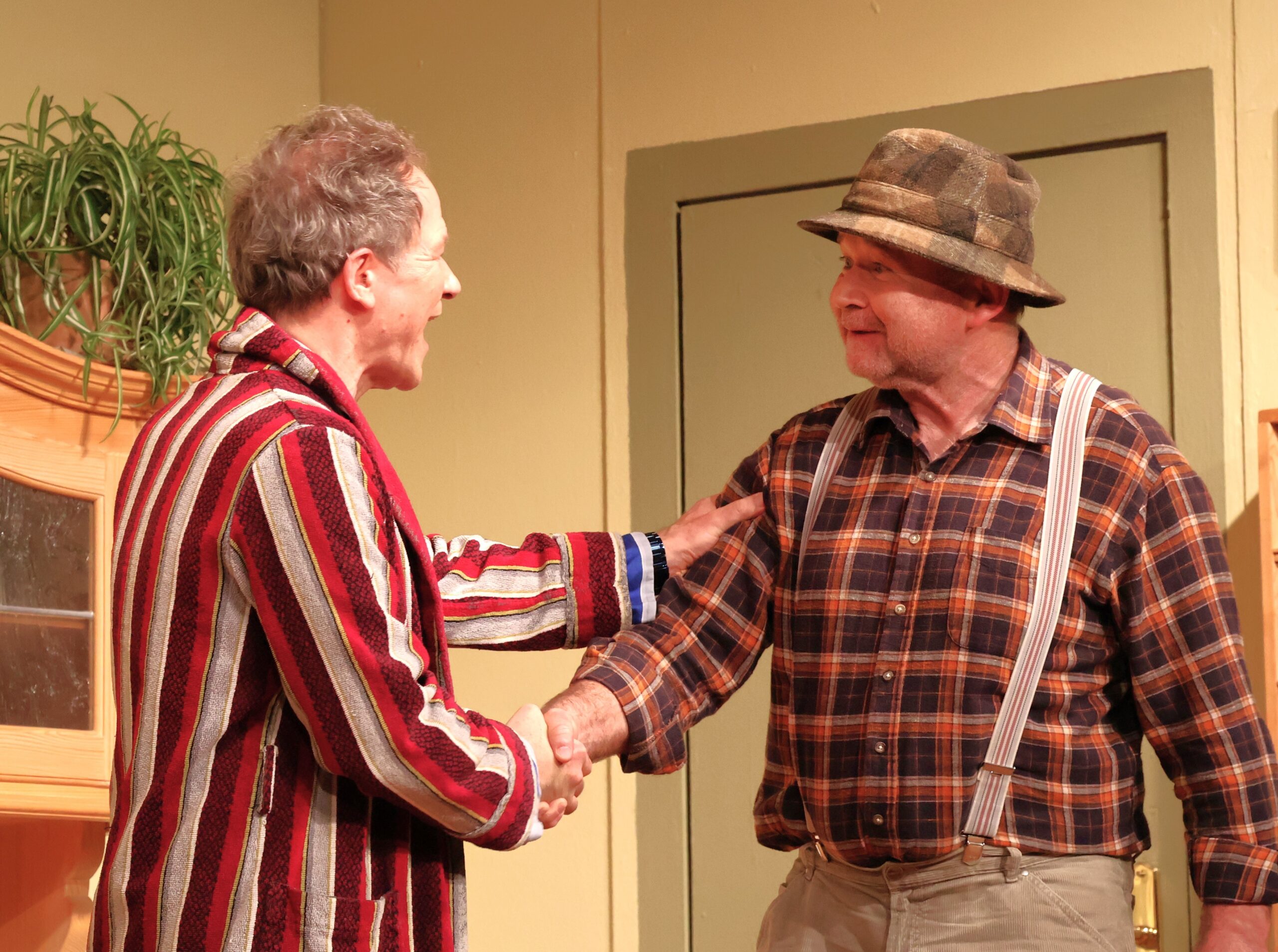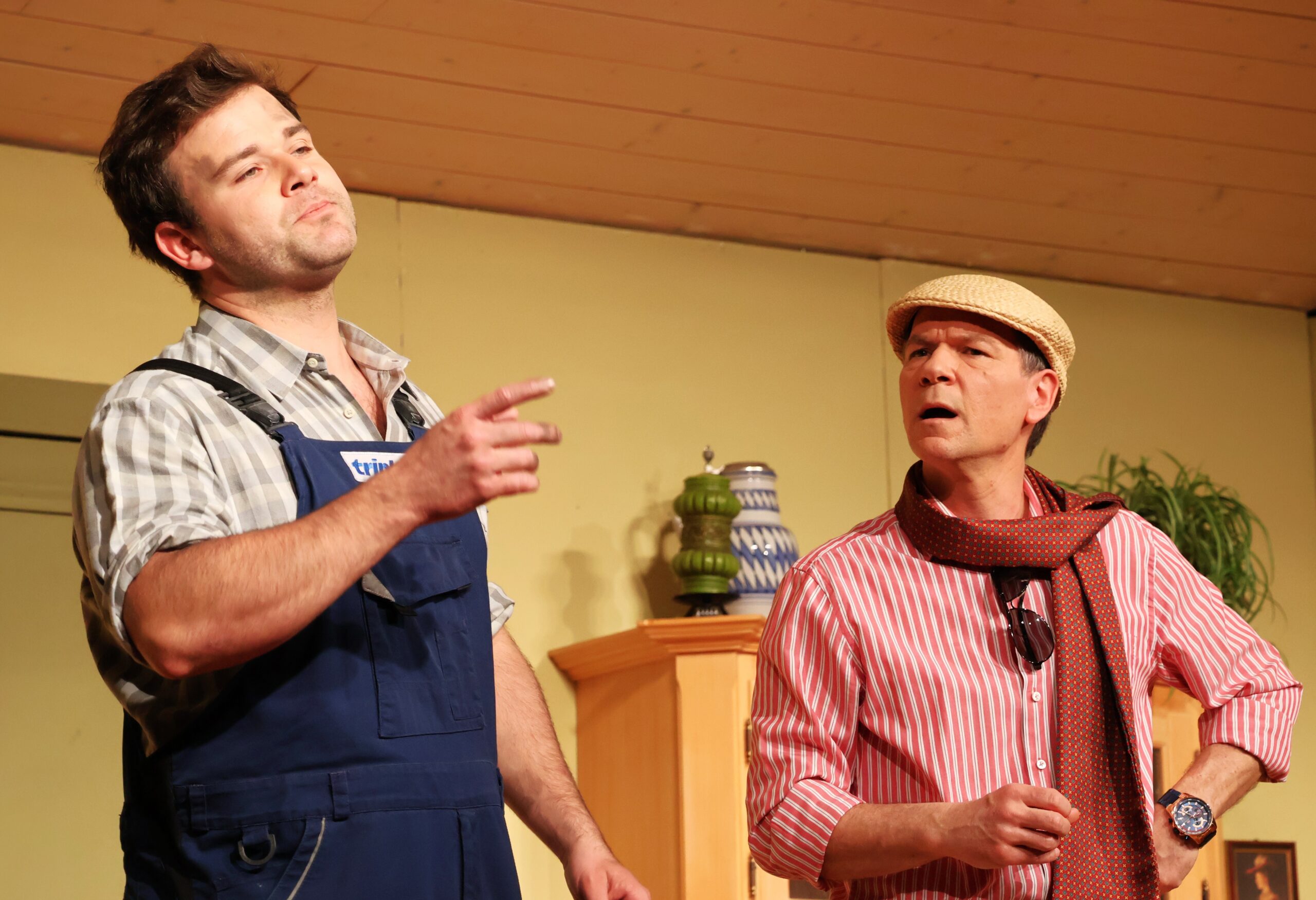 Hubert Bittner (rechts) als Schorsch Pfindlhuber und praktizierender Elias Nicolaisen kommt erst mit seinen Scharlatan-Methoden bei der Damen-Welt supergut an und dann aber ist die Quittung der Dorfgemeinschaft saftig …
