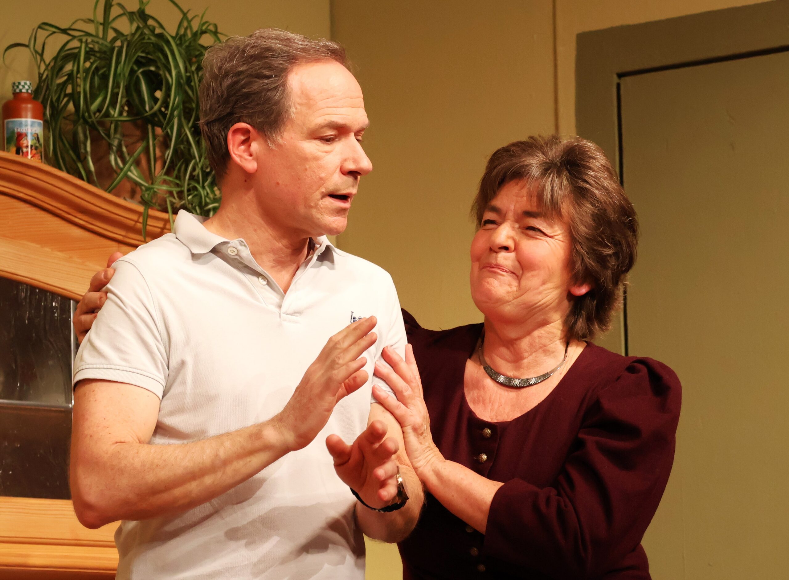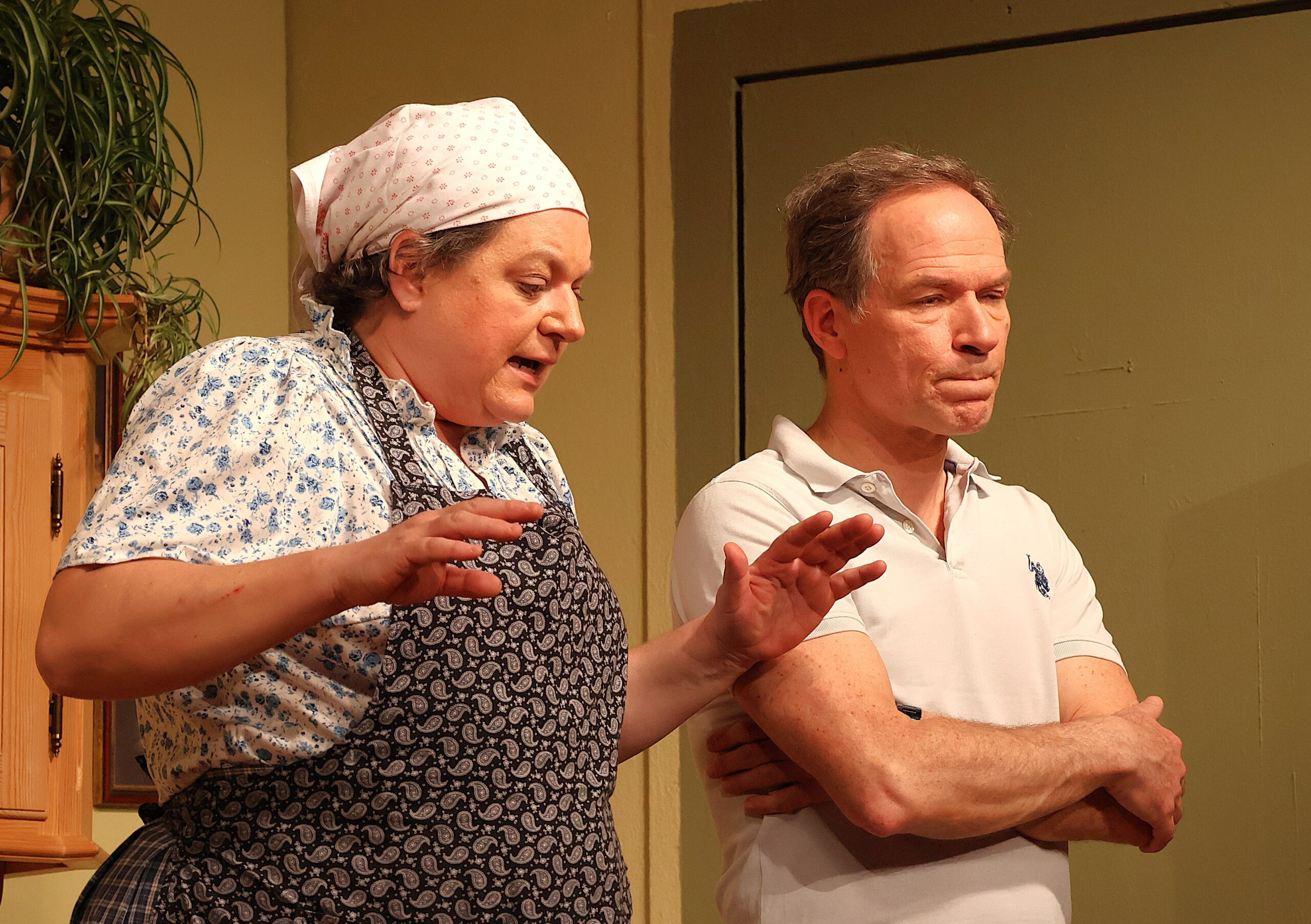 Die zweite Hauptdarstellerin des Abends – bravourös Christa Schindecker als Bäuerin und Wirtin Leni Freudenstein – umgarnt den Lazi wegen der vielen Wehwehchen der Landbewohner sowie auch wegen der Hühner im Stall. Aber sie trifft den Herrn Doktor nicht nur in seiner Eitelkeit damit …