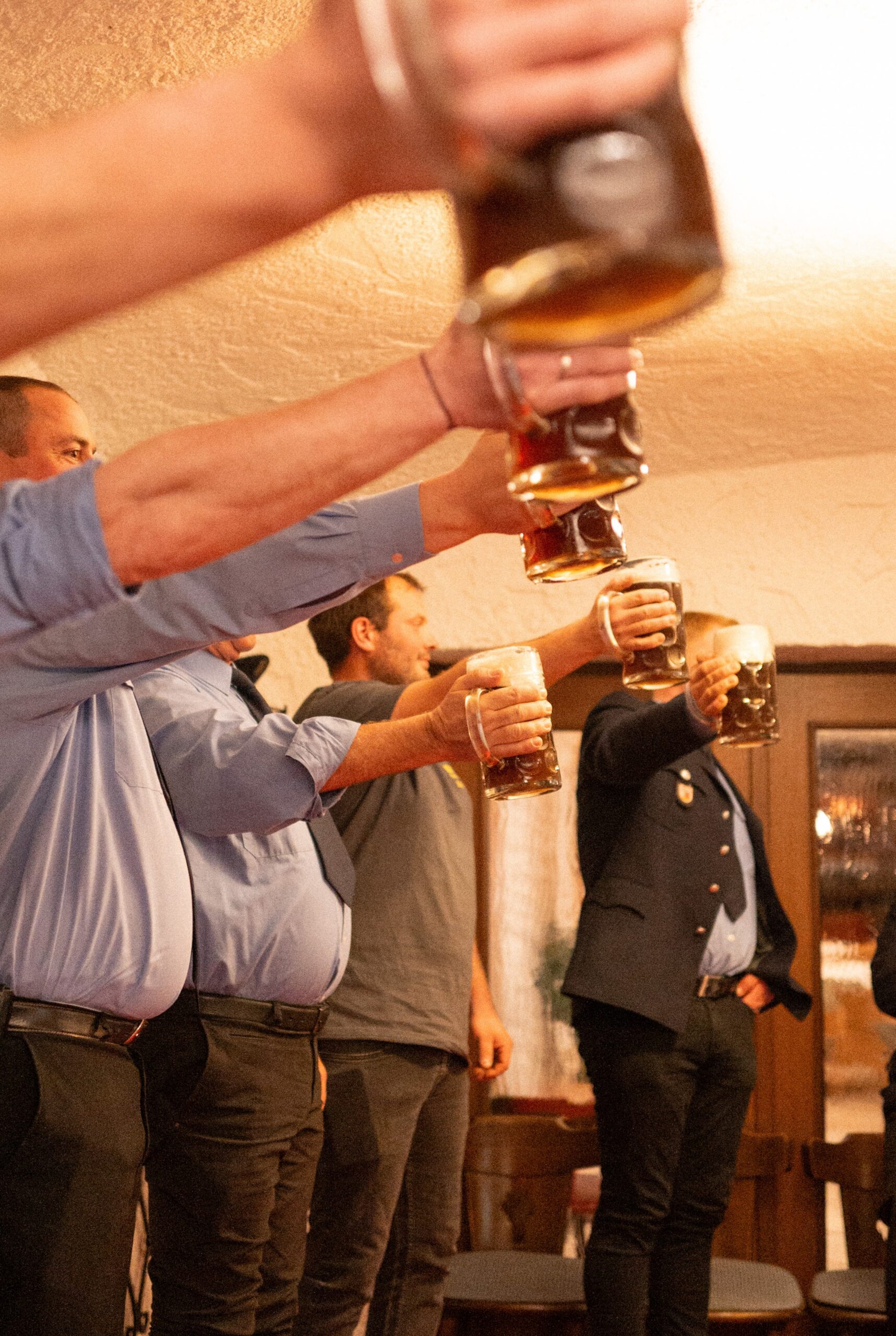 Wie es der Brauch verlangt, blieb es dabei nicht nur bei Worten: Mit humorvollen Aufgaben und kleinen Prüfungen wurde das Bitten um die Patenschaft zu einem unterhaltsamen Ereignis für alle Beteiligten. Mit Unterstützung der Schirmherrin Sissi Schätz knieten die zwei Festleiter und die Vorständin bei den Pyramoosern auf einem extra dafür angefertigten Kantholz.
