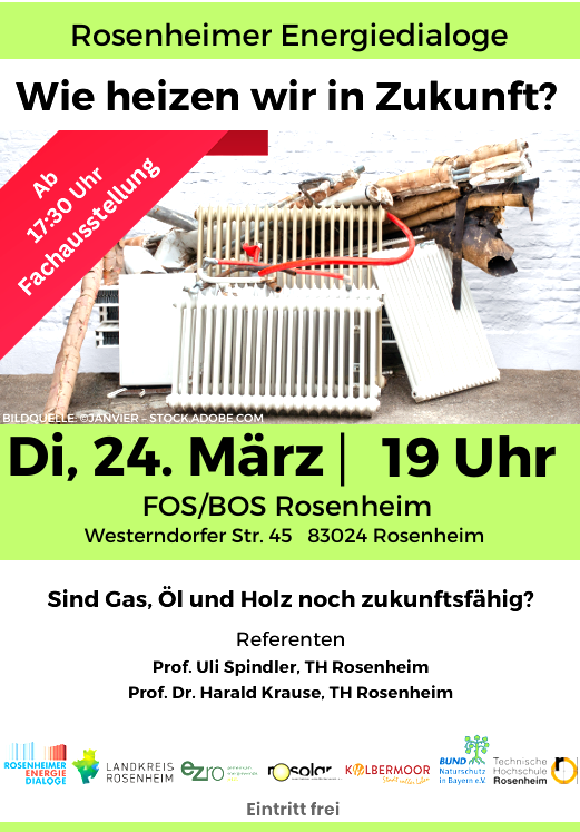 Unter dem Titel „Wie heizen wir in Zukunft?“ findet die nächste Info-Veranstaltung der Initiative „Rosenheimer Energiedialoge“ am Dienstag, 24. März, in der FOS/BOS Rosenheim, Westerndorfer Straße 45, statt. Die Veranstaltung beginnt um 17.30 Uhr mit einer Ausstellung, bei der Fachfirmen ihre Auswahl und Lösungen rund um das Thema Heizen präsentieren.