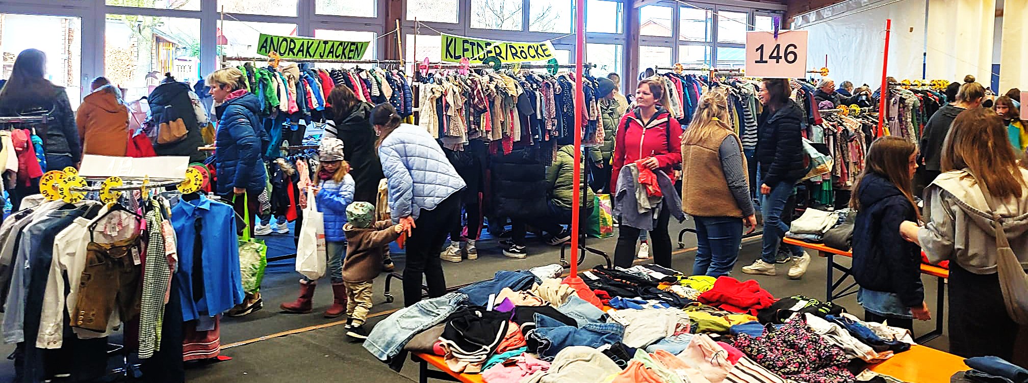 Jetzt war wieder Kleidermarkt-Tag in Babensham – mit sommerlicher Kleidung und Artikeln rund ums Kind. Die ehrenamtlich arbeitenden, über 50 Helferinnen und Helfer leisteten wieder ganze Arbeit, alle Produkte übersichtlich zu arrangieren und nach Größen sortiert zu präsentieren – siehe Foto. Und es hat sich gelohnt für den guten Zweck – der Andrang war groß.