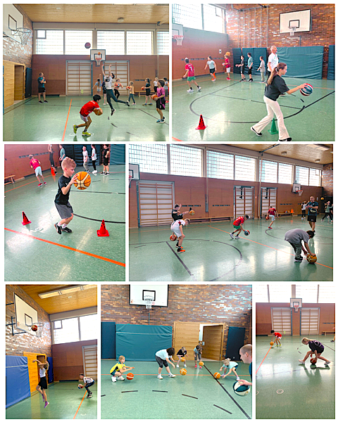 Zum Aufwärmen wurden verschiedene Geschicklichkeitsübungen im Umgang mit dem Basketball vorgestellt und ausprobiert. Eifrig übten die Kinder das Dribbeln zum