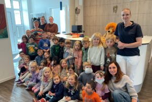 Dr. Tanja Donatin und ihr Praxisteam nahmen sich viel Zeit für die Kinder. Mit einer Löwenhandpuppe und einem großen Gebiss wurde das Zähneputzen noch einmal geübt. Anschließend durften die Kinder selbst als Zahnarzt oder Helfer tätig werden: Sie betrachteten Zähne mit Spiegeln, ließen den Speichel absaugen und hatten großen Spaß beim Auf- und Abfahren auf dem Zahnarztstuhl.