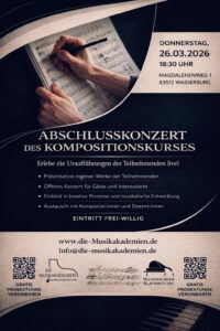 Ein Abschlusskonzert des Kompositionskurses der Wasserburger Musikakademie findet am morgigen Donnerstag, 26. März, um 18.30 Uhr im Hope-Center (Magdalenenweg 1) statt.