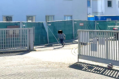 Dieses Kind der Sammelunterkunft für geflüchtete Menschen in Rott am Eckfeld versuchte, unter dem Absperrungs-Zaun der Unterkunft hindurch auf die Straße im Gewerbegebiet mit Schwerlastverkehr zu gelangen.