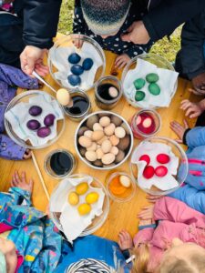 Im Montessori Haus für Kinder ist so einiges los – um dem Osterhasen etwas unter die Pfoten zu greifen, kochen und färben die Kinder Ostereier. In einem Topf über offenem Feuer wurden die Eier gekocht und anschließend in den schönsten Farben gefärbt. Und, wer weiß, vielleicht landet das ein oder andere Ei im selbst gebastelten Nest …