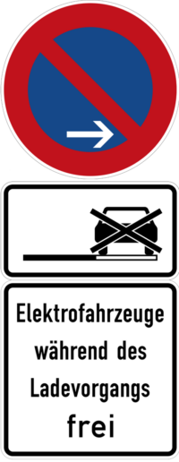 Eine häufige Beschilderung ist die Kombination aus dem Verkehrszeichen 314 (Parken) und einem einschränkenden Zusatzzeichen. Möglich sind beispielsweise die Zeichen 1010-66 („elektrisch betriebene Fahrzeuge“) oder 1050-32 („Elektrofahrzeuge während des Ladevorgangs“). Der Unterschied dabei ist: Das Zusatzzeichen 1010-66 gilt grundsätzlich nur für Fahrzeuge mit E-Kennzeichen (beziehungsweise entsprechend gekennzeichnete Fahrzeuge). Das Zusatzzeichen 1050-32 hingegen erlaubt das Parken für Elektrofahrzeuge nur während des tatsächlichen Ladevorgangs.