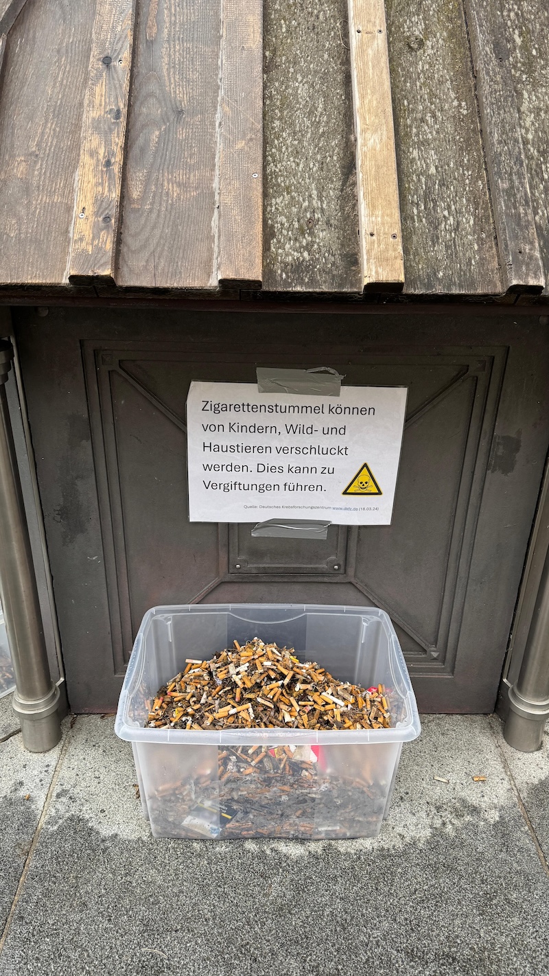 Doch die Aktion sollte nicht nur kurzfristig wirken, sondern auch die Öffentlichkeit sensibilisieren. Deshalb gibt es aktuell am Rathaus eine kleine „Ausstellung“. Dort sind selbst gestaltete „Zigarettenstummel-Modelle“ der Fünftklässler zu sehen, die auf eindrucksvolle Weise auf die Problematik aufmerksam machen. Zusätzlich wurde eine große Sammelbox aufgestellt, in der die gesammelten Zigarettenstummel sichtbar aufbewahrt werden – als klares Zeichen dafür, wie viel Müll täglich in unserer Umwelt landet.