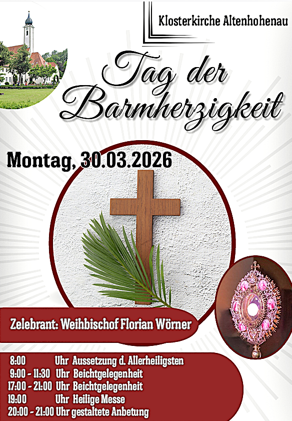 Die Pfarrverband Rott meldet: Am kommenden Montag, 30. März, ist in der Klosterkirche Altenhohenau wieder der „Tag der Barmherzigkeit“: Um 8 Uhr wird das Allerheiligste zur Anbetung ausgesetzt.