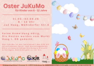 In den Osterferien erwartet Kinder im Alter von sechs bis zwölf Jahren ein abwechslungsreiches und kreatives Programm: Das Oster-JuKuMo lädt von Dienstag, 31. März, bis Donnerstag, 2. April, jeweils von 8 bis 13 Uhr, zu spannenden Kulturspielaktionen ins JuZ Haag (Mühldorfer Straße 4) ein.