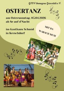 Am kommenden Ostersonntag, 5. April, findet wieder der traditionelle Ostertanz des Trachtenvereins „Immagrea“ Griesstätt im Gasthaus Schmid in Kerschdorf statt.