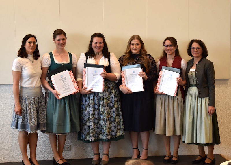 Foto oben (von links): 3. Semester Hauswirtschaft, die Besten: Semesterleiterin Dr. Anja Mayr; Magdalena Läßser (Pienzenau) Notendurchschnitt 1,0; Johanna Fuchs (Freyung) Notendurchschnitt 1,76; Marlene Huber (Grafing) Notendurchschnitt 1,86; Hildegard Aimer (Lohkirchen) Notendurchschnitt 1,86; Schulleiterin Anna Bruckmeier.