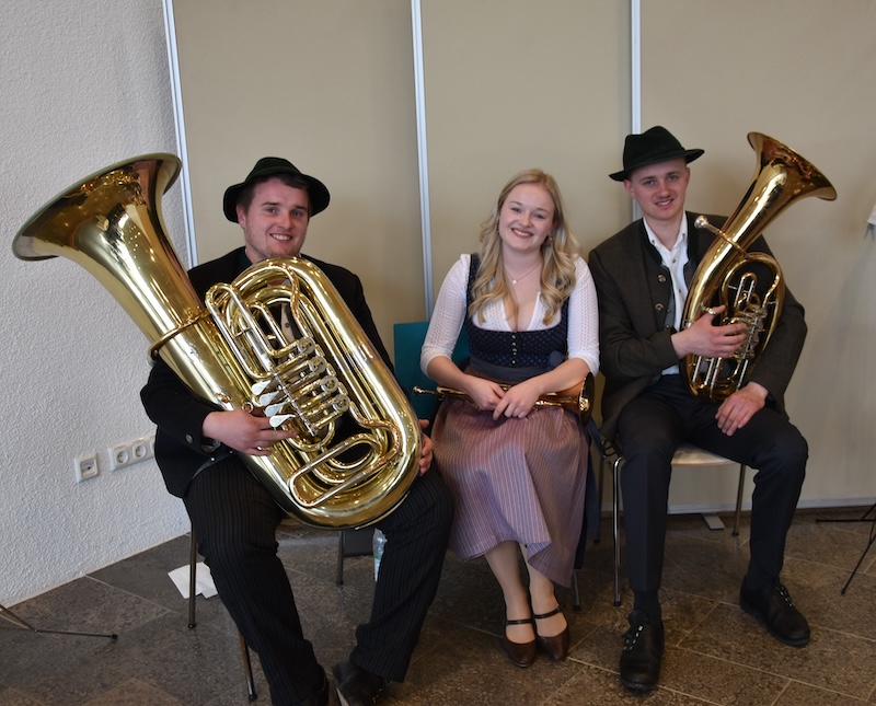 Die Blechbläser Vinzenz Wörndl Tuba, Antonia Wörndl Flügelhorn und Lorenz Buchner Tenorhorn.