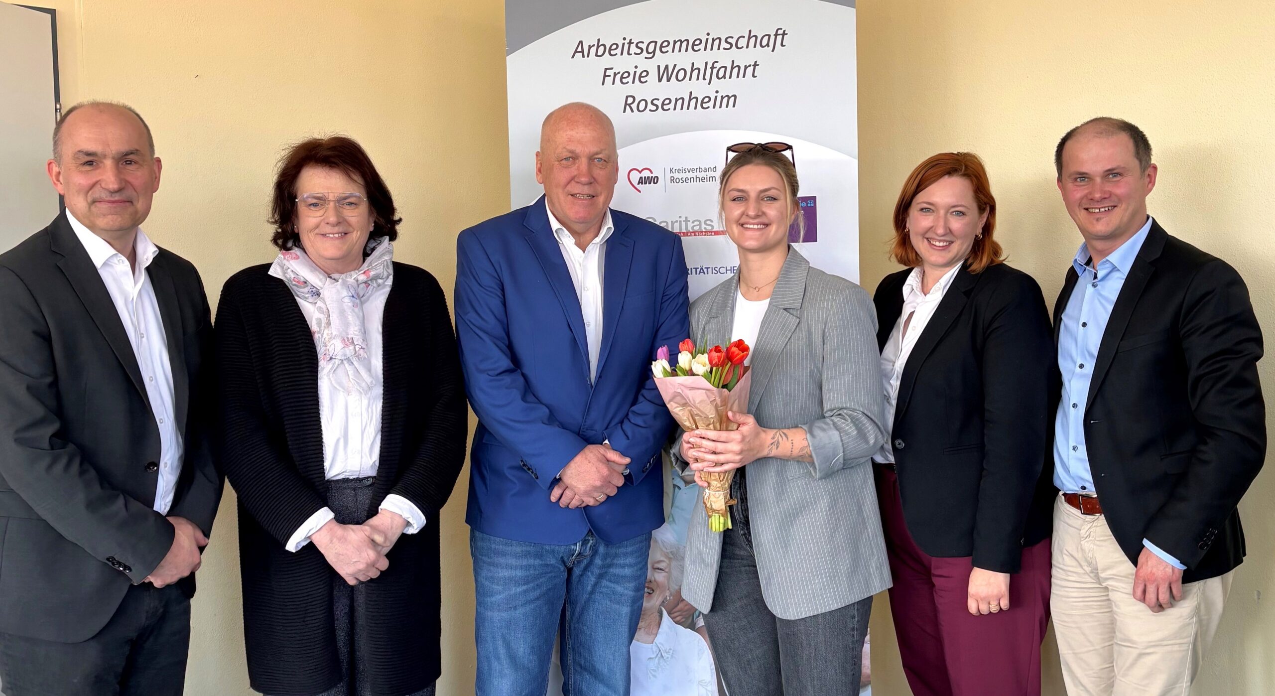Anton Reiserer (AWO), Marianne Baur, den neuen Sprecher Klaus Voss (Diakonie Rosenheim), Veronika Leidl (Paritäter), Amelie Guggenberger (BRK) und Wolfgang Ehrenlechner (Caritas).