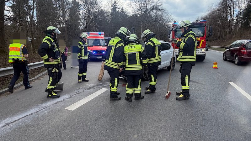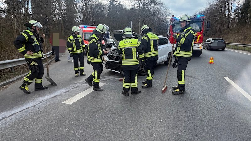 Freitagnachmittag, 14.45 Uhr: Unfall auf der B304 bei Wasserburg. Auf auf Höhe des Parkplatzes an der Inn-Brücke sind zwei Pkw zusammengeprallt. Im Einsatz sind die Feuerwehr Attel-Reitmehring, die Polizei und Rettungsdienst. Die Feuerwehr leitet den Verkehr einspurig an der Unfallstelle vorbei. Polizeibericht folgt. Fotos: WS