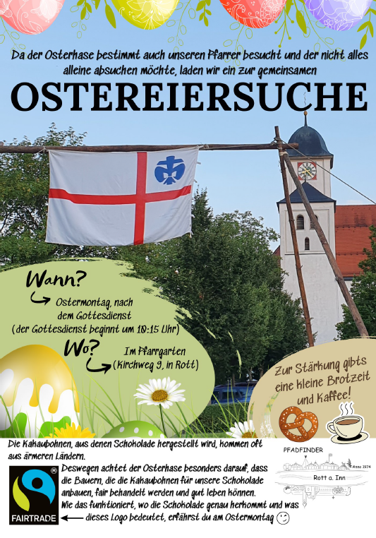 Die Kinder in Rott dürfen sich freuen: Am heutigen Ostermontag gibt es nach dem Gottesdienst um 10.15 Uhr eine gemeinsame Ostereier-Suche im Pfarrgarten am Kirchweg 9. Die Pfadfinder laden zudem zu einer kleinen Brotzeit mit Kaffee für die Erwachsenen ein.