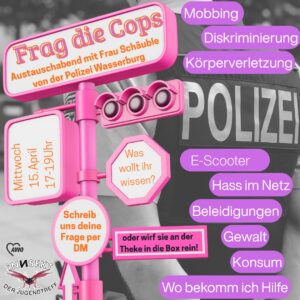 „Frag die Cops“ – am Mittwoch, 15. April, haben alle Jugendlichen von 17 bis 19 Uhr Gelegenheit, im Jugendtreff „Innsekt“ Fragen an die Polizei zu stellen.