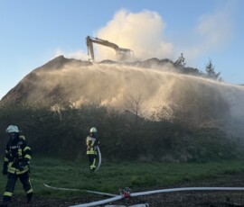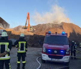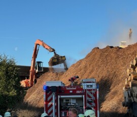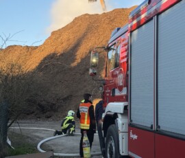 UPDATE: Gegen 7.30 Uhr ist die Lage unter Kontrolle. Allerdings gestaltet sich das Löschen des Brandes in dem gewaltigen Hackschnitzel-Lager schwierig. Es dürfte noch einige Zeit in Anspruch nehmen.