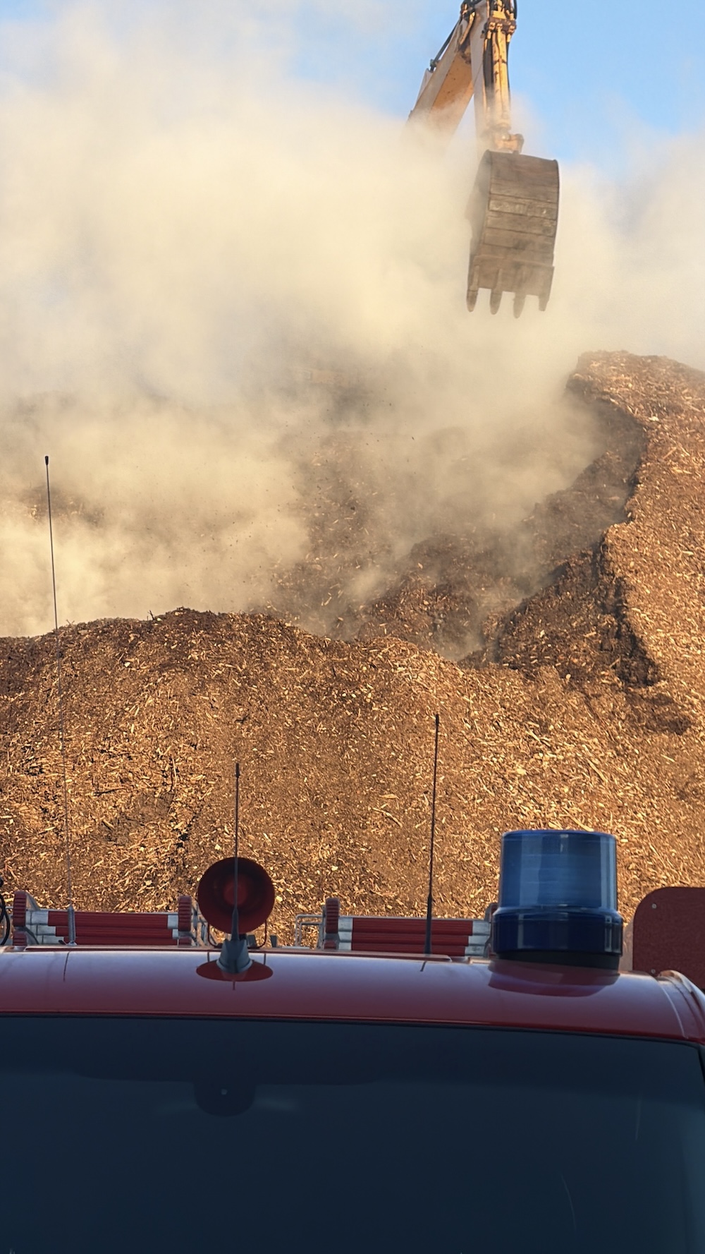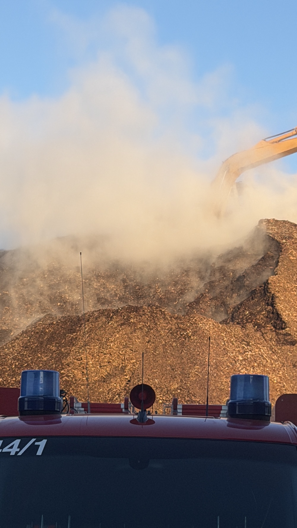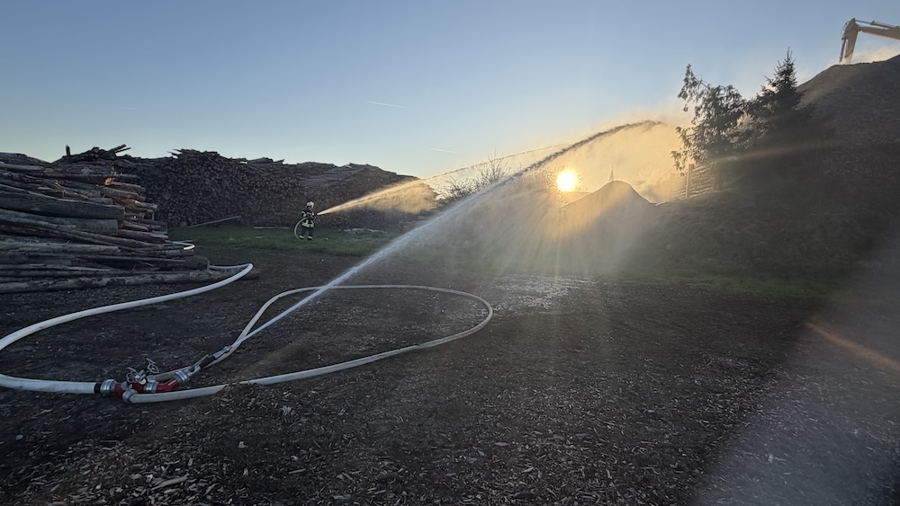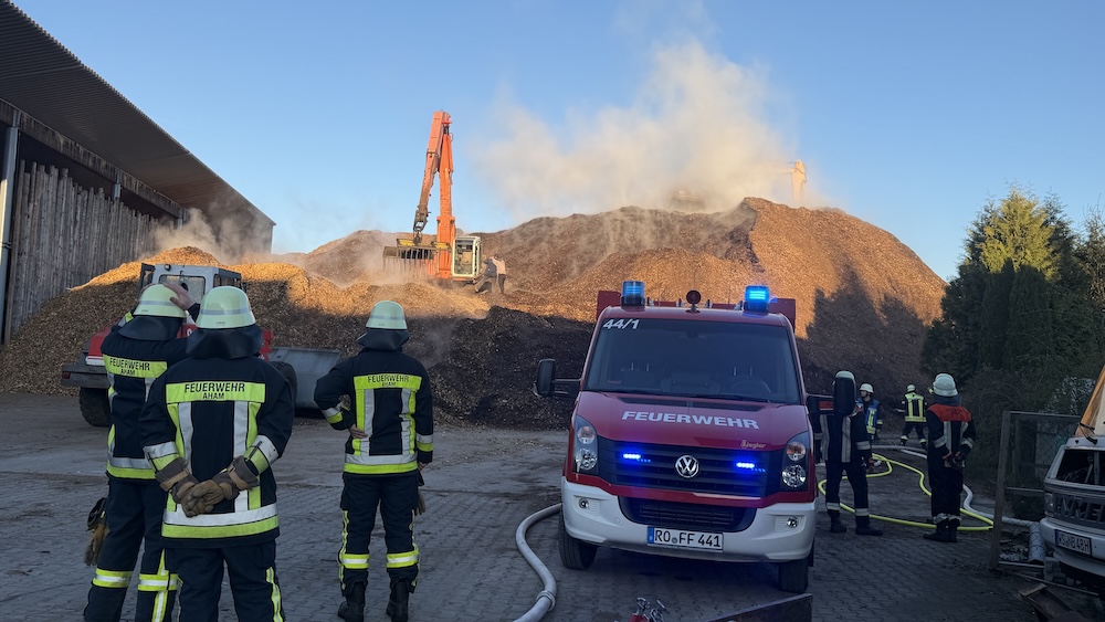 UPDATE: Gegen 7.30 Uhr ist die Lage unter Kontrolle. Allerdings gestaltet sich das Löschen des Brandes in dem gewaltigen Hackschnitzel-Lager schwierig. Es dürfte noch einige Zeit in Anspruch nehmen.