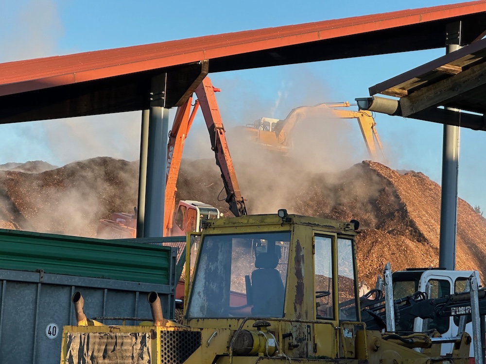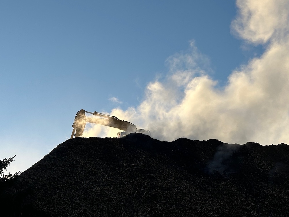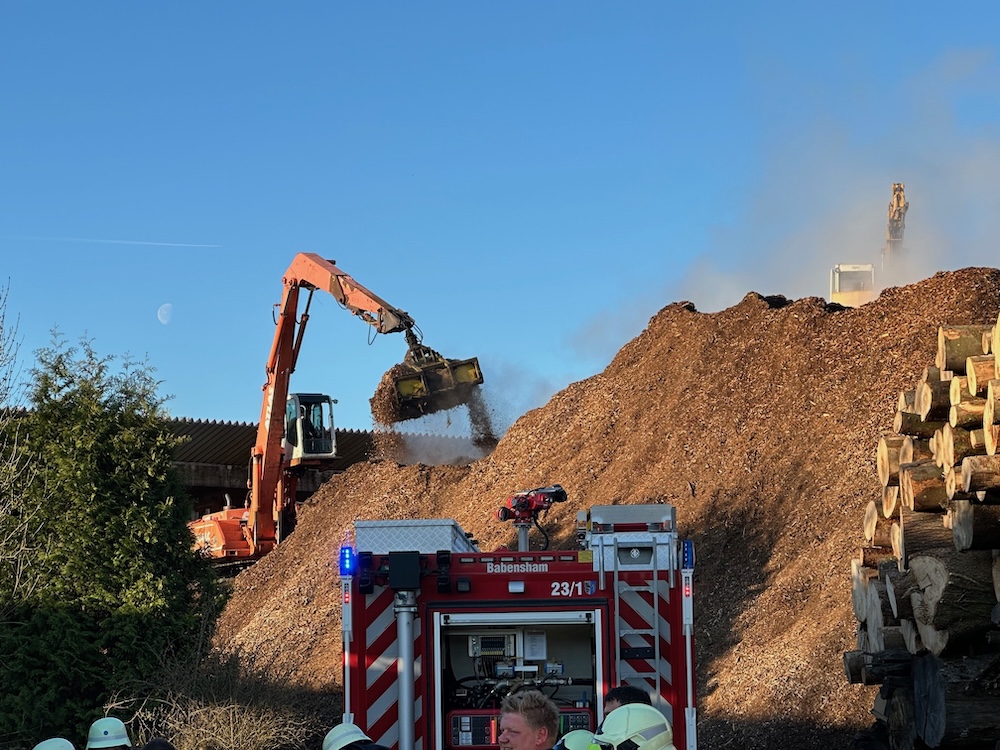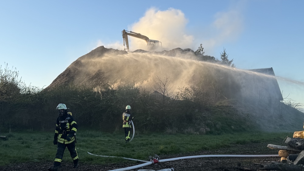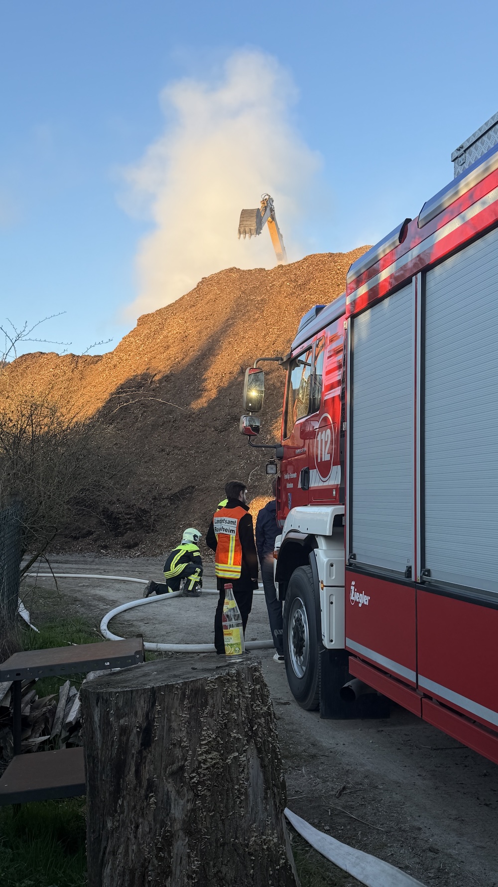 UPDATE: Gegen 7.30 Uhr ist die Lage unter Kontrolle. Allerdings gestaltet sich das Löschen des Brandes in dem gewaltigen Hackschnitzel-Lager schwierig. Es dürfte noch einige Zeit in Anspruch nehmen.