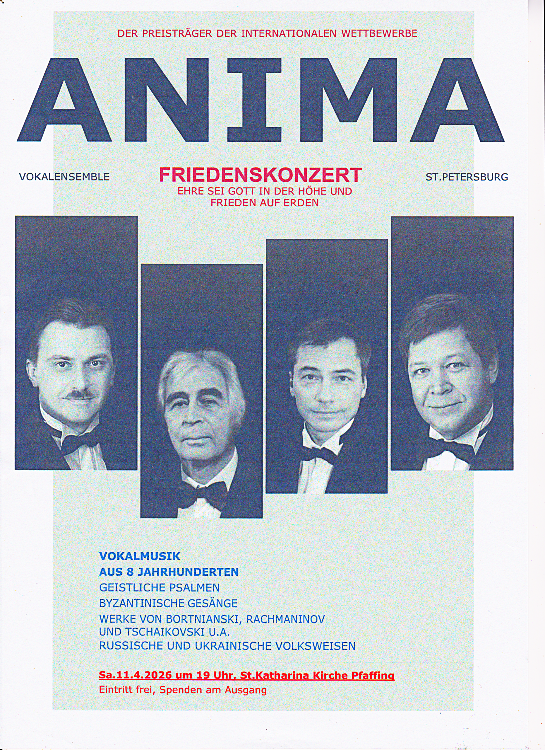 Dieses Konzert in Pfaffing steht im Zeichen des Friedens und soll als musikalische Brücke zwischen Kulturen dienen. In der besonderen Atmosphäre der Pfarrkirche werden die Sänger von „Anima“ Werke präsentieren, die die universelle Sprache der Musik als Mittel zur Verständigung und Versöhnung hervorheben – als kraftvolle Botschaft der Musik.