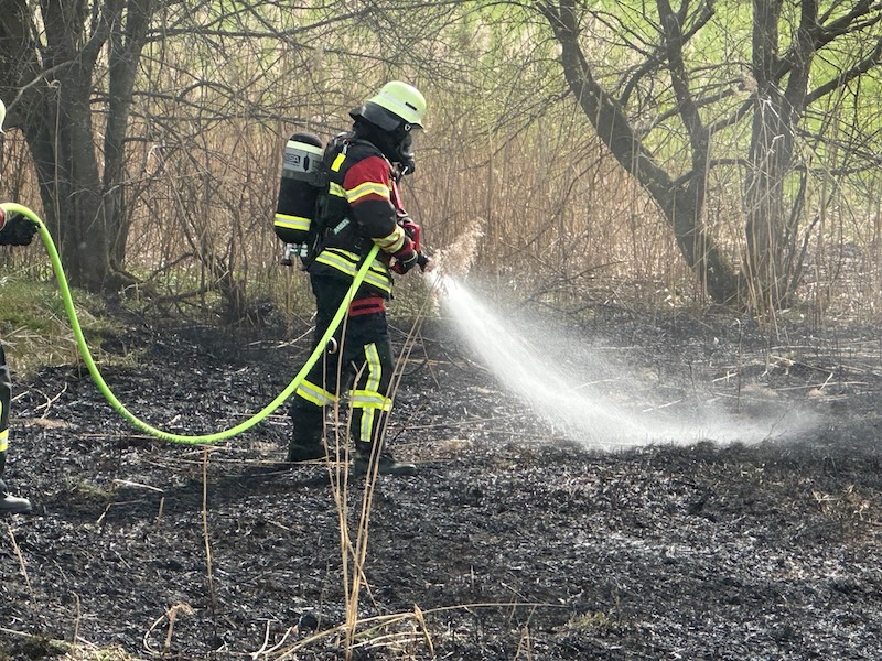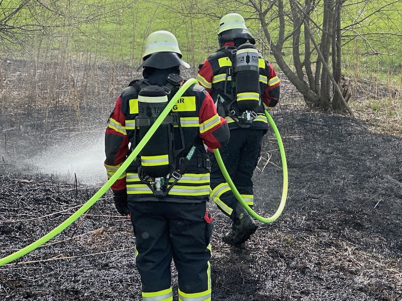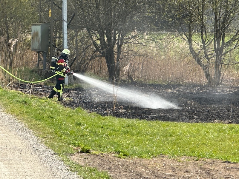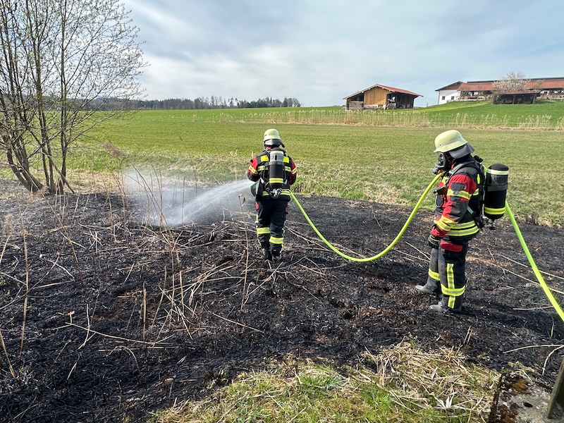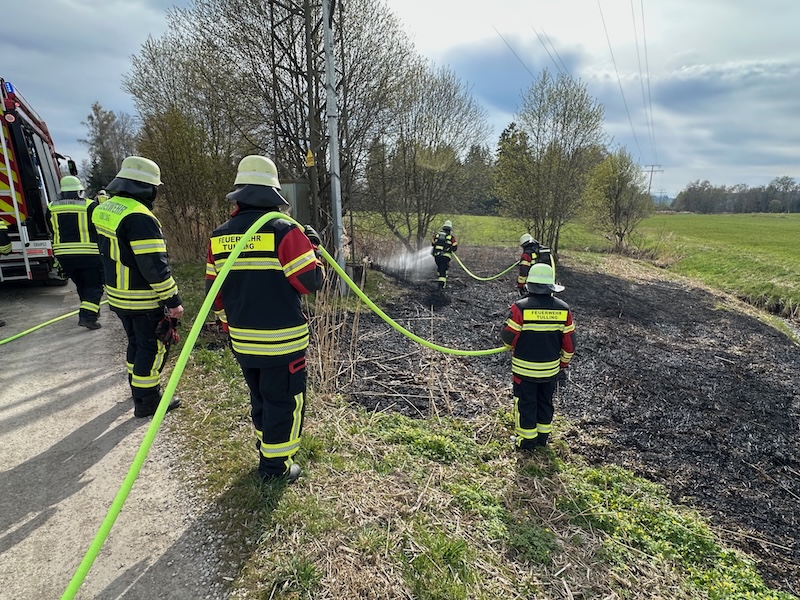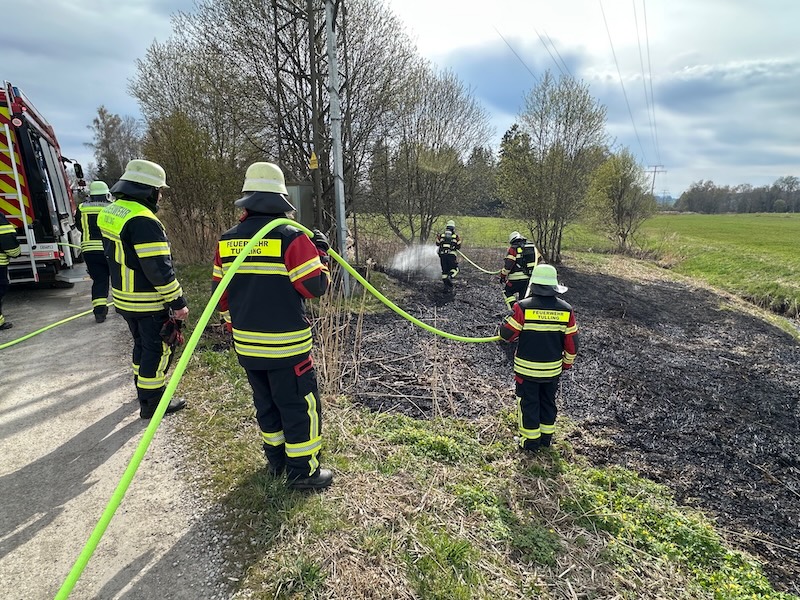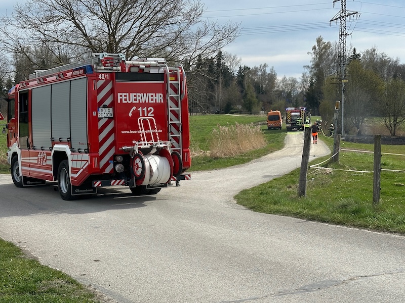 Alarm für die Feuerwehren Pfaffing und Tulling am Donnerstagnachmittag: Gegen 16 Uhr rückten die Floriansjünger zum Weiler Untermoos bei Forsting aus. Dort brannte es nahe eines Hochspannungsmastens auf einer Freifläche. Das Feuer war zum Glück rasch unter Kontrolle. Die Brandursache ist noch nicht geklärt. Fotos: Georg Barth
