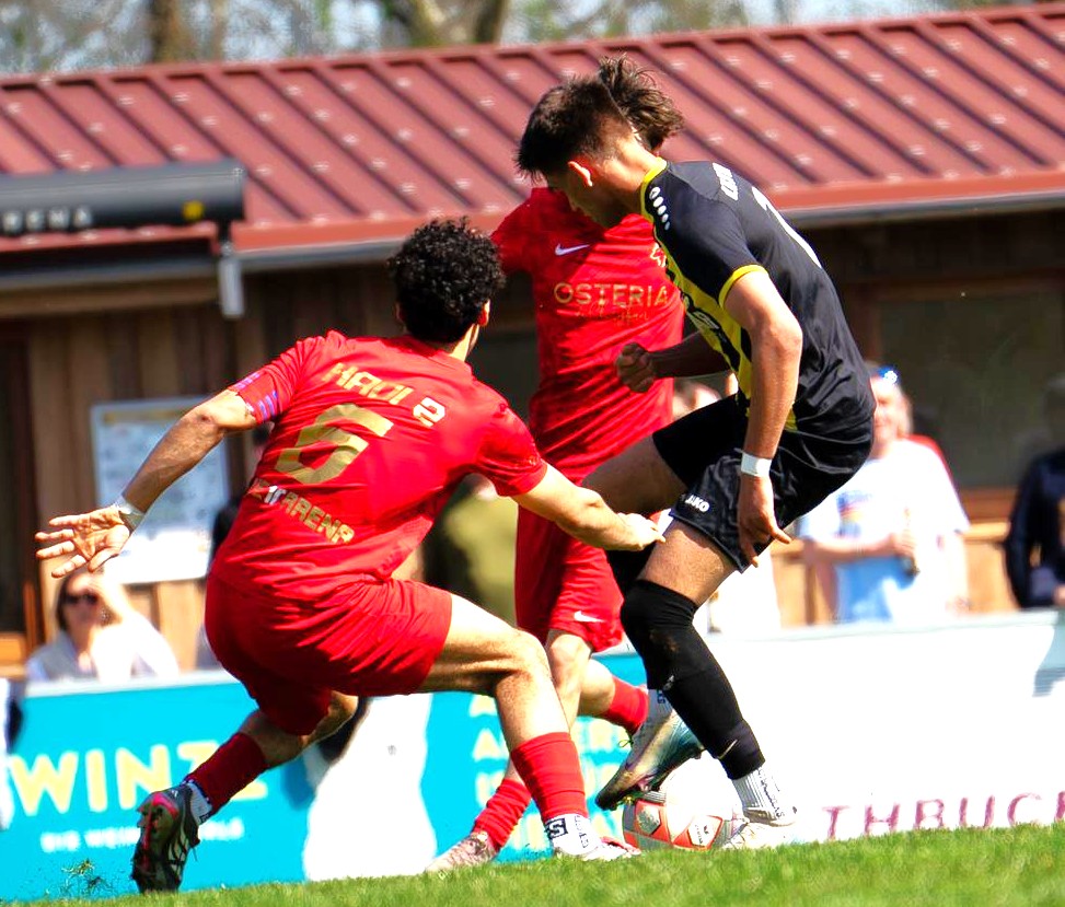 Das Foto zeigt den Edlinger Theo Golla (schwarzes Dress) im Zweikampf mit Hadi Zaraket (links).