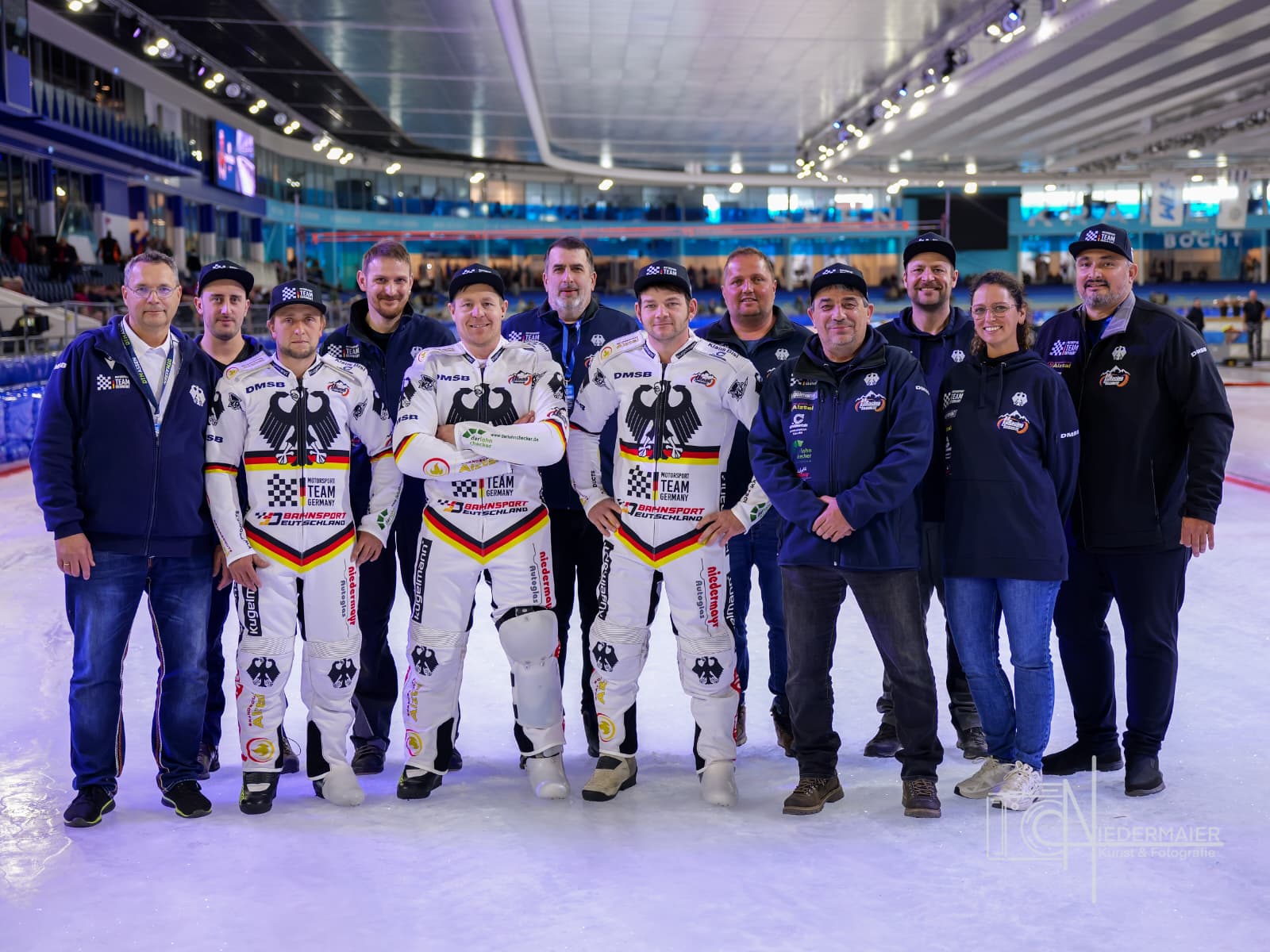 Spannend ging’s von Freitag bis zum heutigen Sonntag im holländischen Heerenveen beim Eisspeedway zu. Neben Einzelmeisterschaften stand heute die Team-WM auf dem Programm. Und dabei holten sich die Fahrer vom Inn-Isar-Racing-Team aus Wasserburg, die die deutschen Farben vertraten, im internationalen Starterfeld einen überragenden dritten Platz. Die drei Fahrer, die den Erfolg errangen: Max Niedermaier aus Edling (rechts im Rennanzug), Christoph Kirchner (Allgäu) und Maximilian Niedermaier (links) aus Jakobneuharting mit dem Betreuer-Stab und den Verantwortlichen (rechts: Team-Chef Christian Platzer).