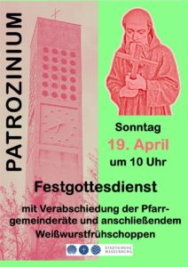 Am kommenden Sonntag, 19. April, wird in St. Konrad in Wasserburg Patrozinium gefeiert. Der Festgottesdienst beginnt um 10 Uhr, gestaltet vom Chor der Stadtkirche, mit Verabschiedung der ehemaligen Pfarrgemeinderäte. Anschließend Weißwurstfrühschoppen im Pfarrsaal St. Konrad.