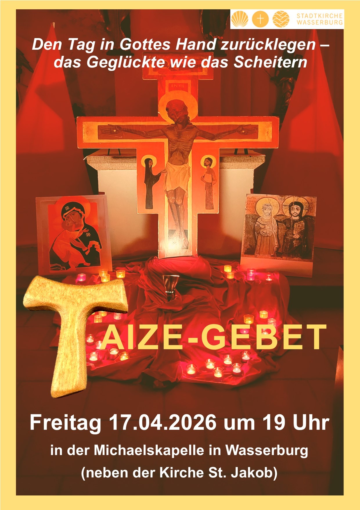 Die Stadtkirche Wasserburg lädt ein zum Taizegebet am heutigen Freitag, 17. April, um 19 Uhr in der Michaelskapelle (direkt neben der St. Jakobskirche) – einem Abendgebet bei Kerzenschein, Singen und Stille zur inneren Einkehr.