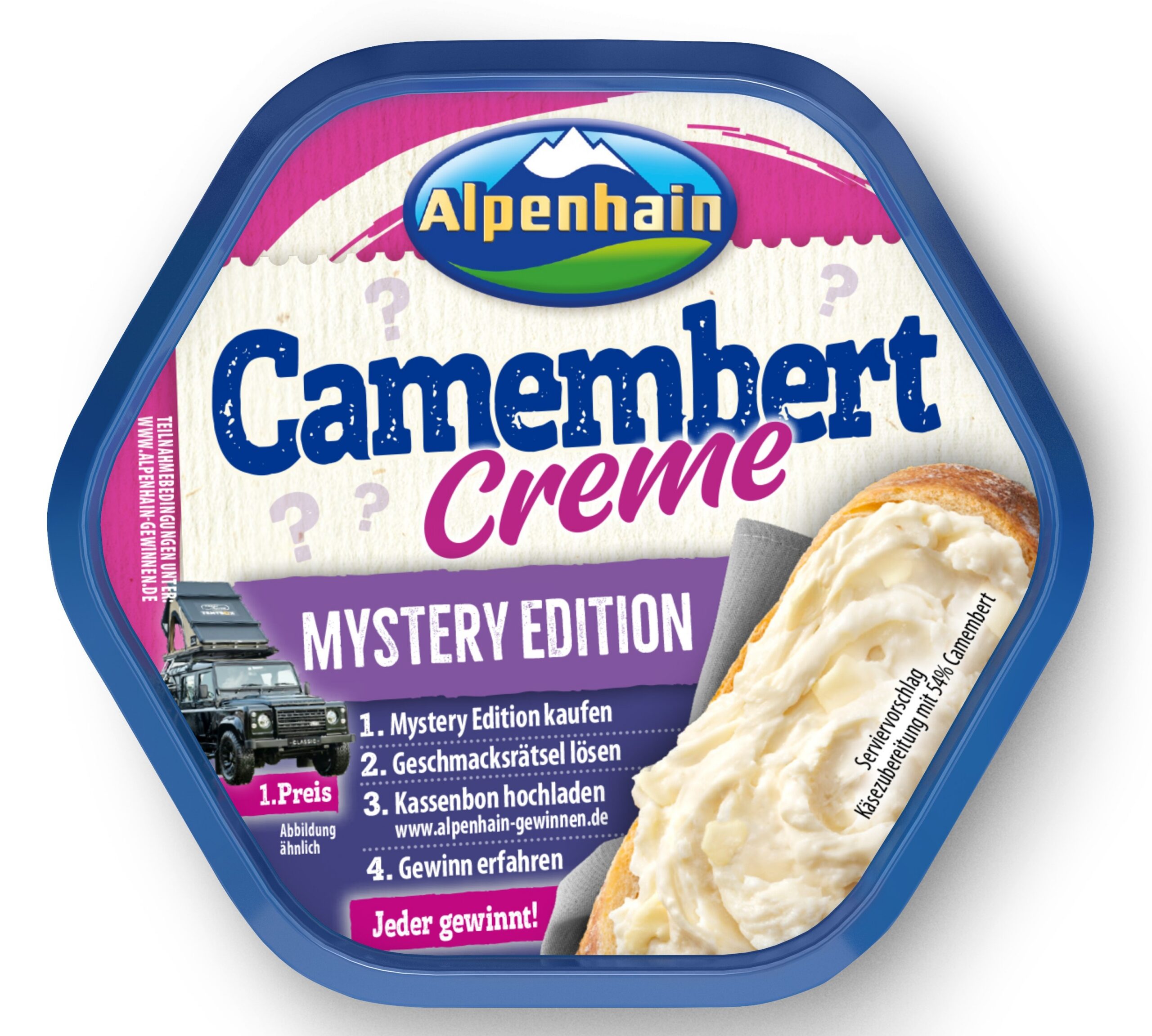 PR – Die Traditionskäserei Alpenhain aus Lehen in der Gemeinde Pfaffing sorgt mit einem neuen Produkt im Kühlregal für Neugier und Gesprächsstoff: Mit der limitierten „Camembert Creme Mystery Edition“ bringt das Unternehmen im Aktionsgeschäft ab sofort eine Sonderedition in den ausgewählten Lebensmitteleinzelhandel, bei der Konsumenten einen geheimen Geschmack entschlüsseln können.